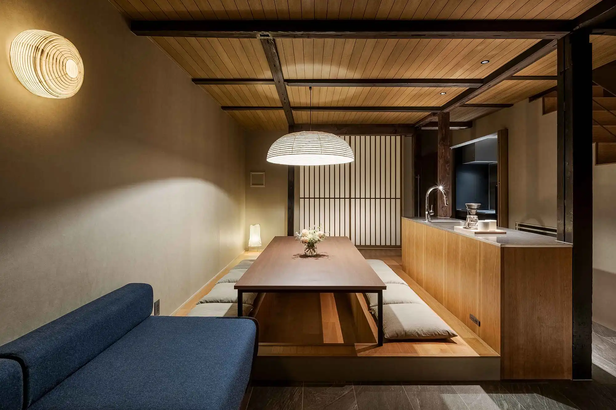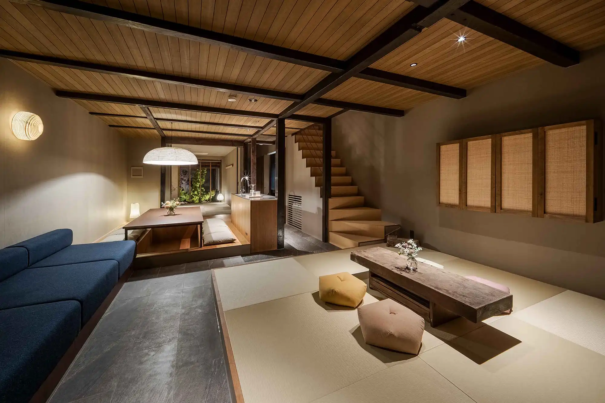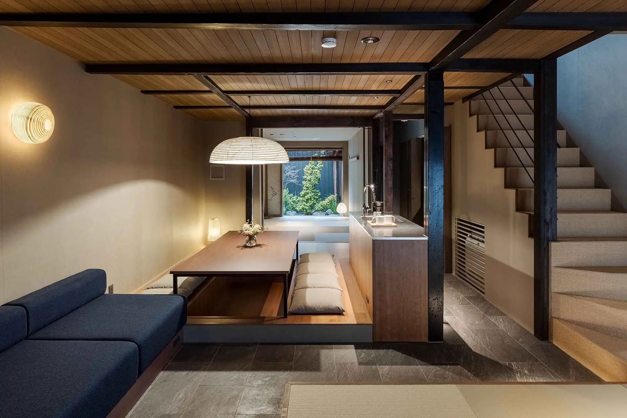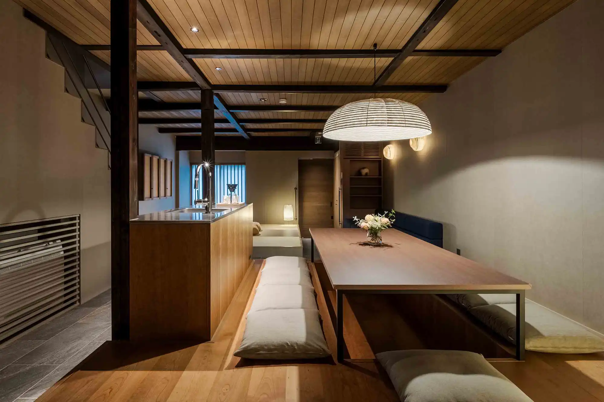 ‘Mitsuna’ machiya house: a traditional Japanese holiday home (vacation rental) inspired by the narrow alleys that weave through the historic Miyagawacho and Gion districts of Kyoto. This distinctive machiya showcases the tsushinikai architectural style, featuring an intermediate floor design, unique to Kyoto townhouses. During your stay, you'll be within walking distance of Gion, as well as Kiyomizu Temple, Kenninji Temple, the Kamogawa River, and more.