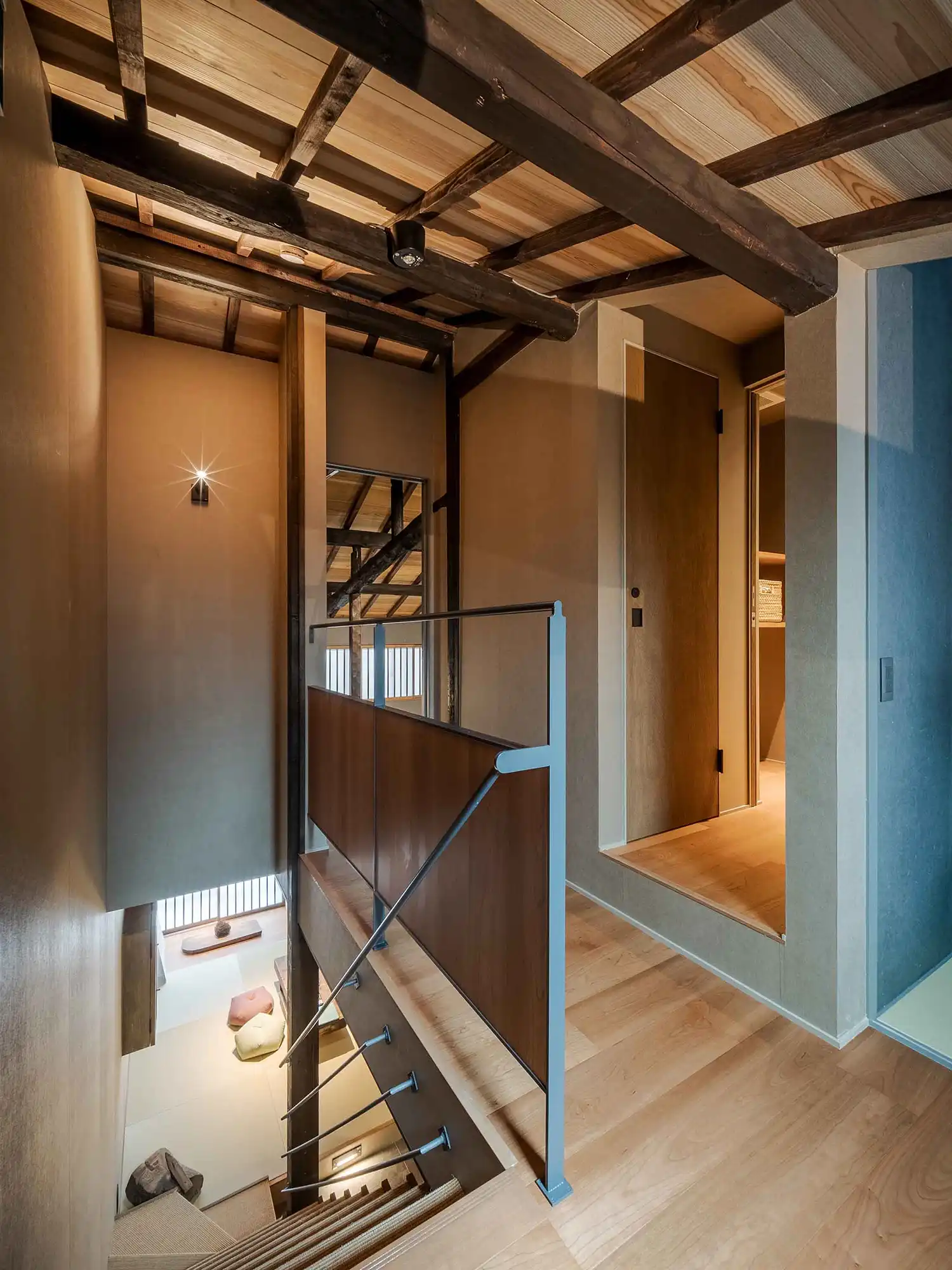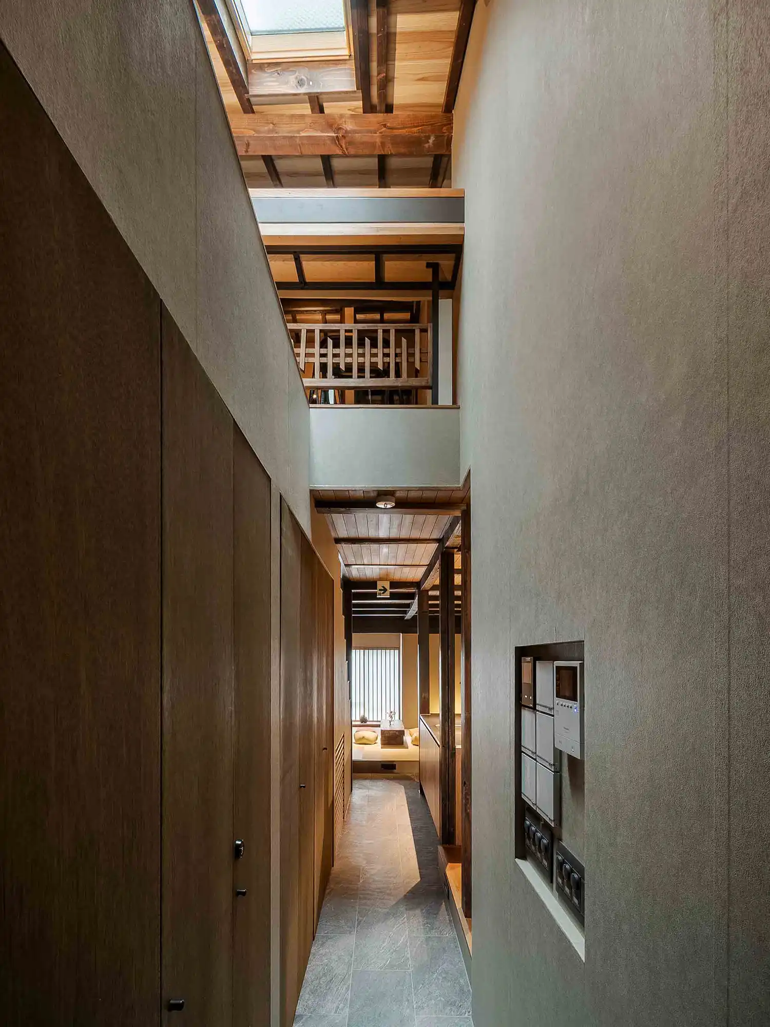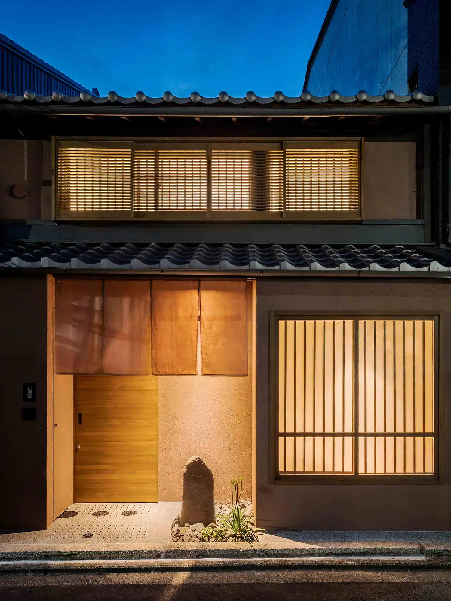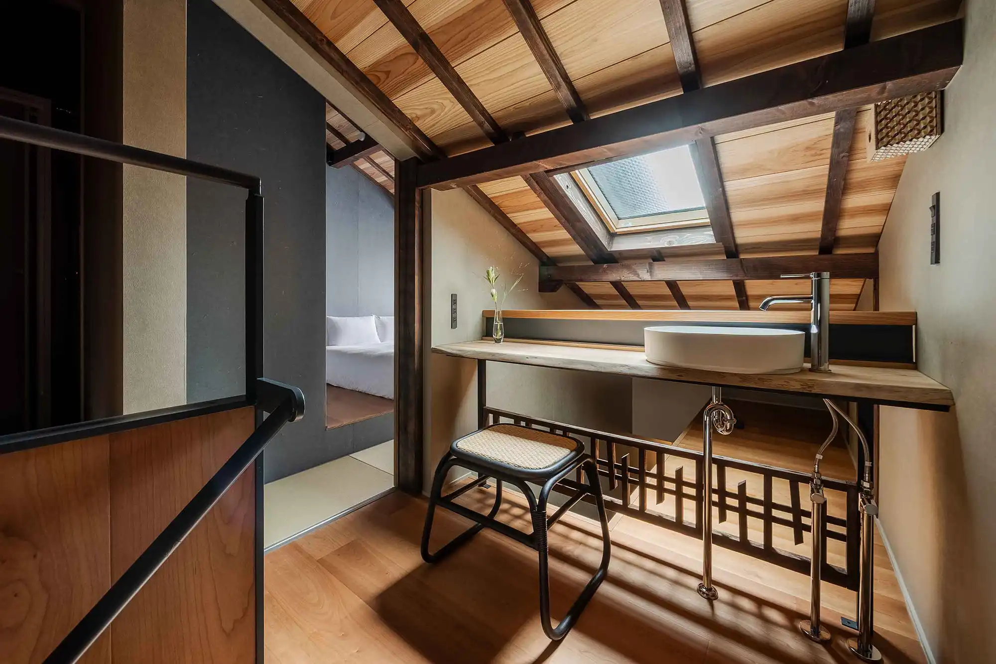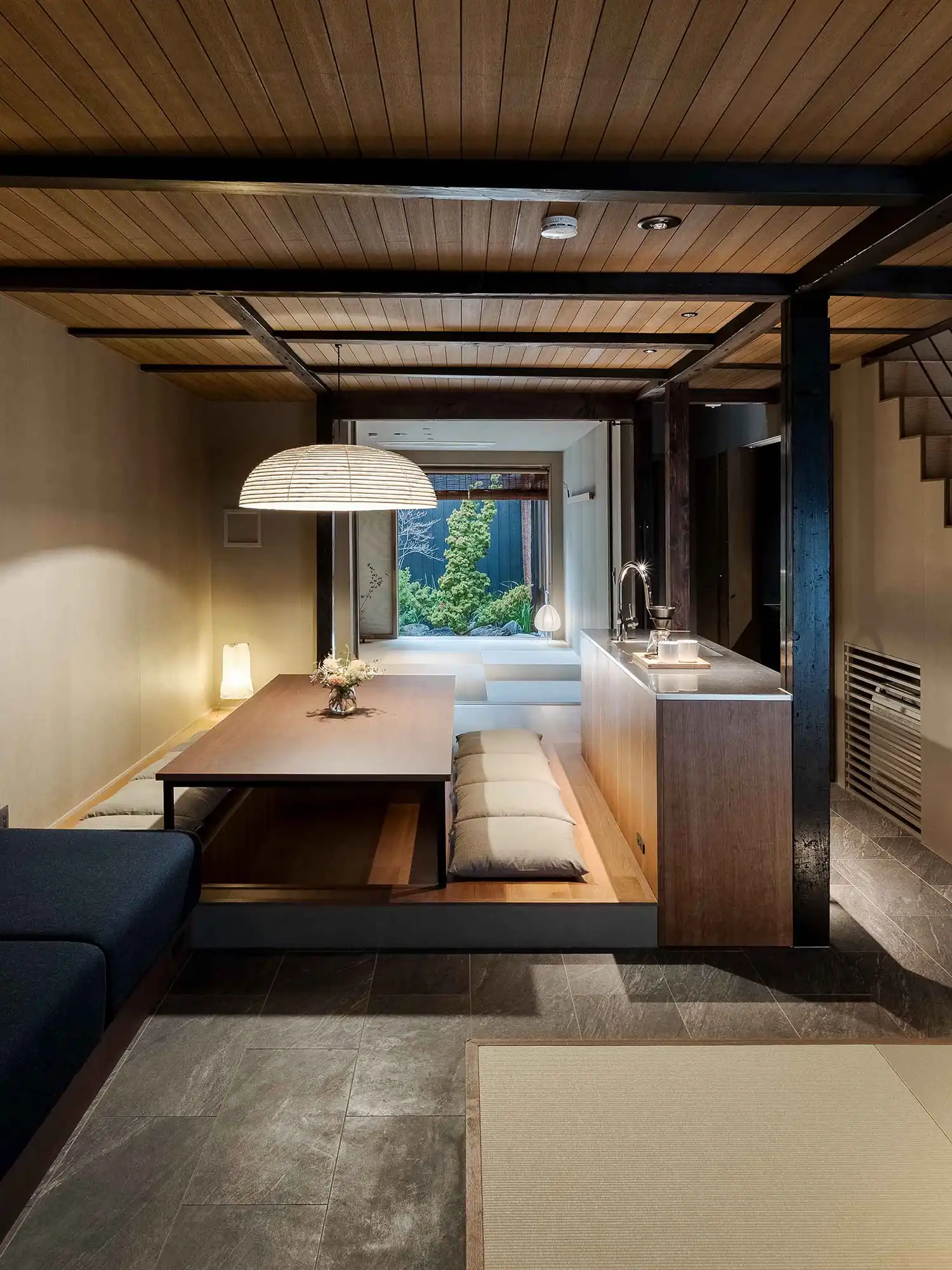 ‘Mitsuna’ machiya house: a traditional Japanese holiday home (vacation rental) inspired by the narrow alleys that weave through the historic Miyagawacho and Gion districts of Kyoto. This distinctive machiya showcases the tsushinikai architectural style, featuring an intermediate floor design, unique to Kyoto townhouses. During your stay, you'll be within walking distance of Gion, as well as Kiyomizu Temple, Kenninji Temple, the Kamogawa River, and more.