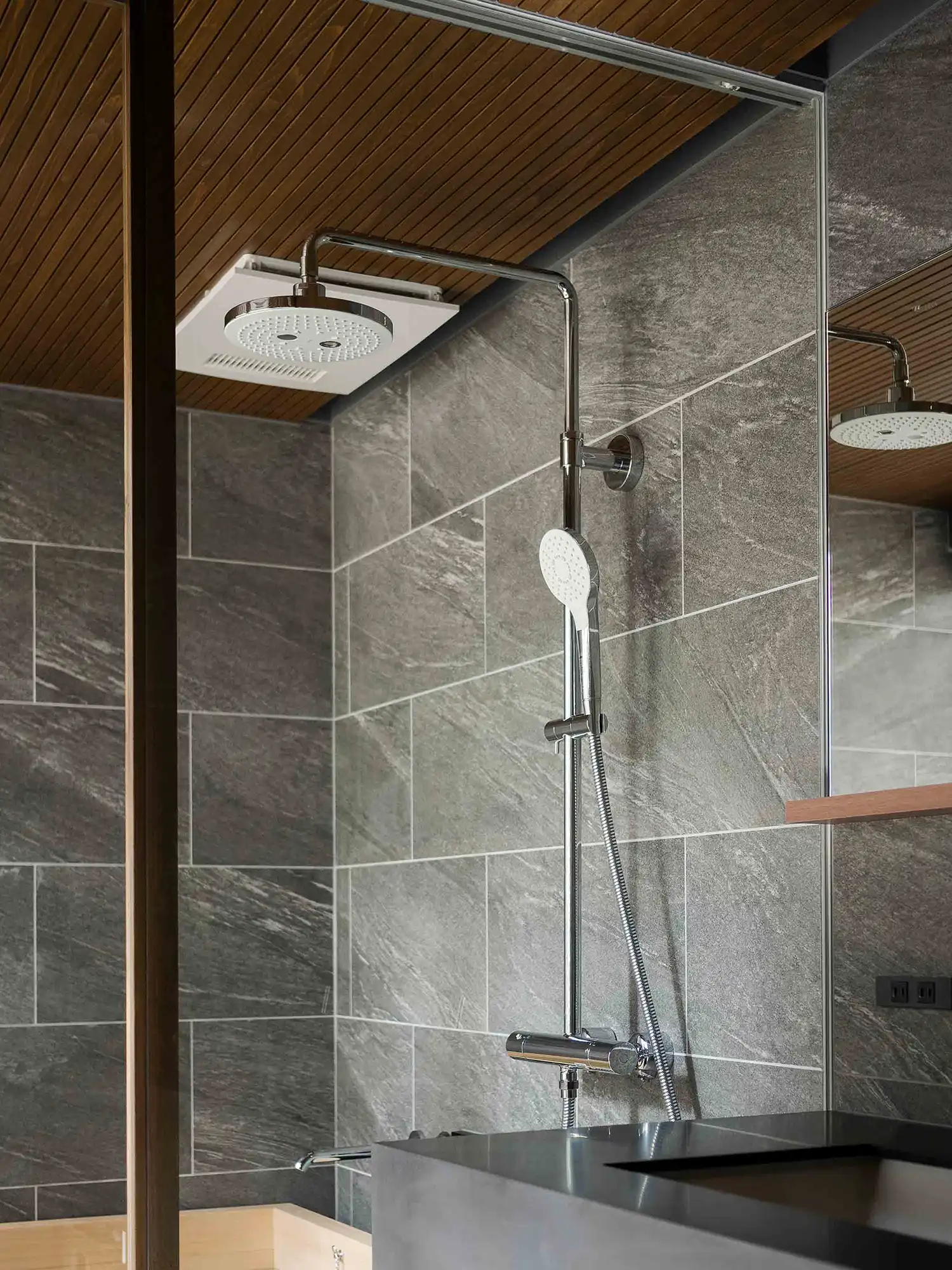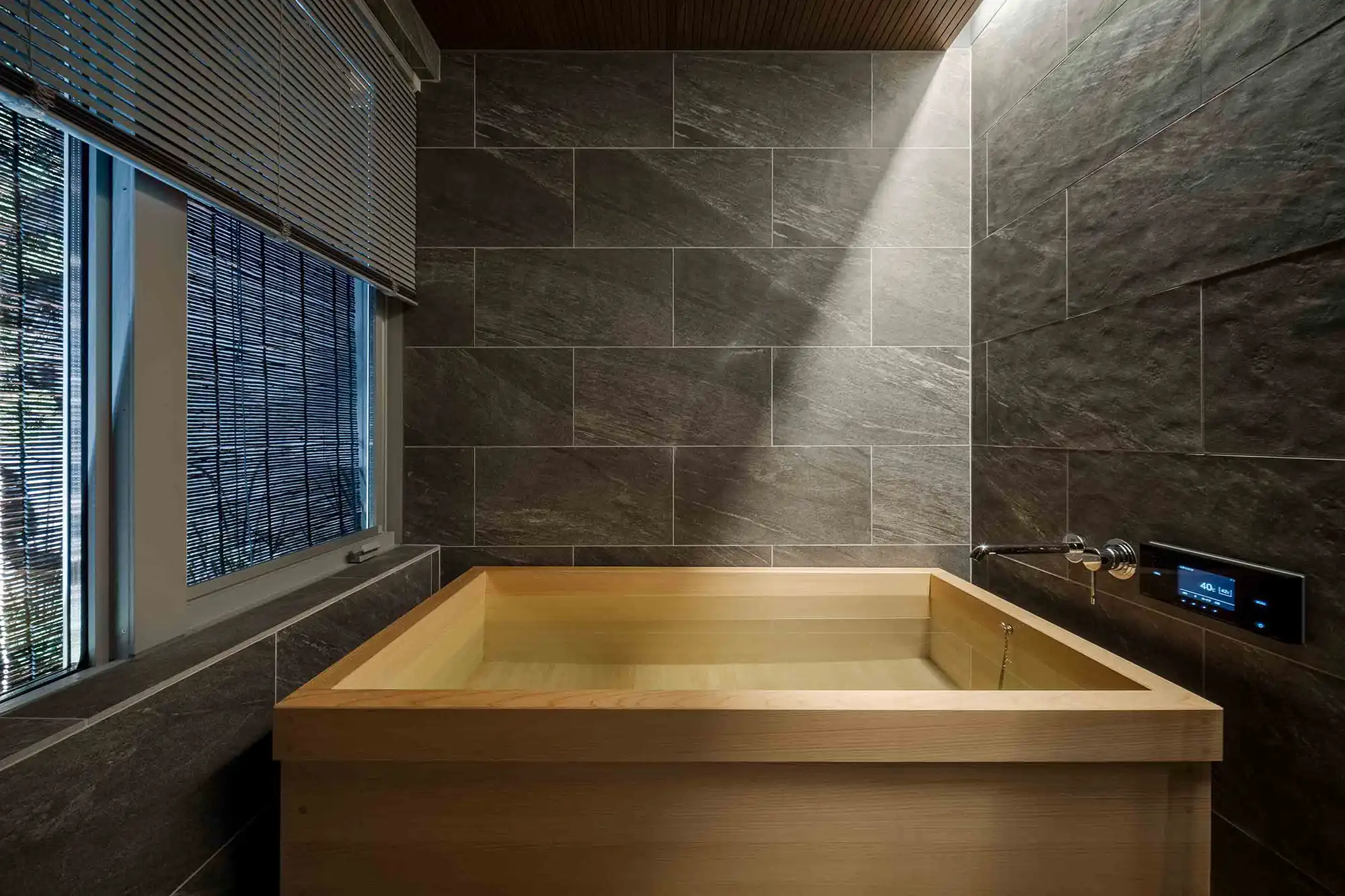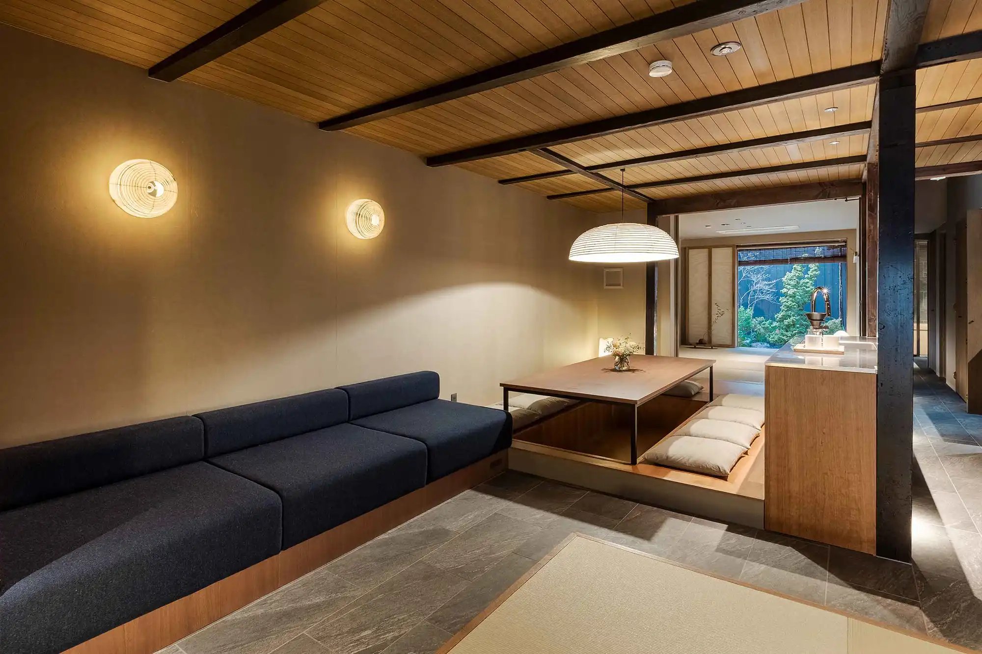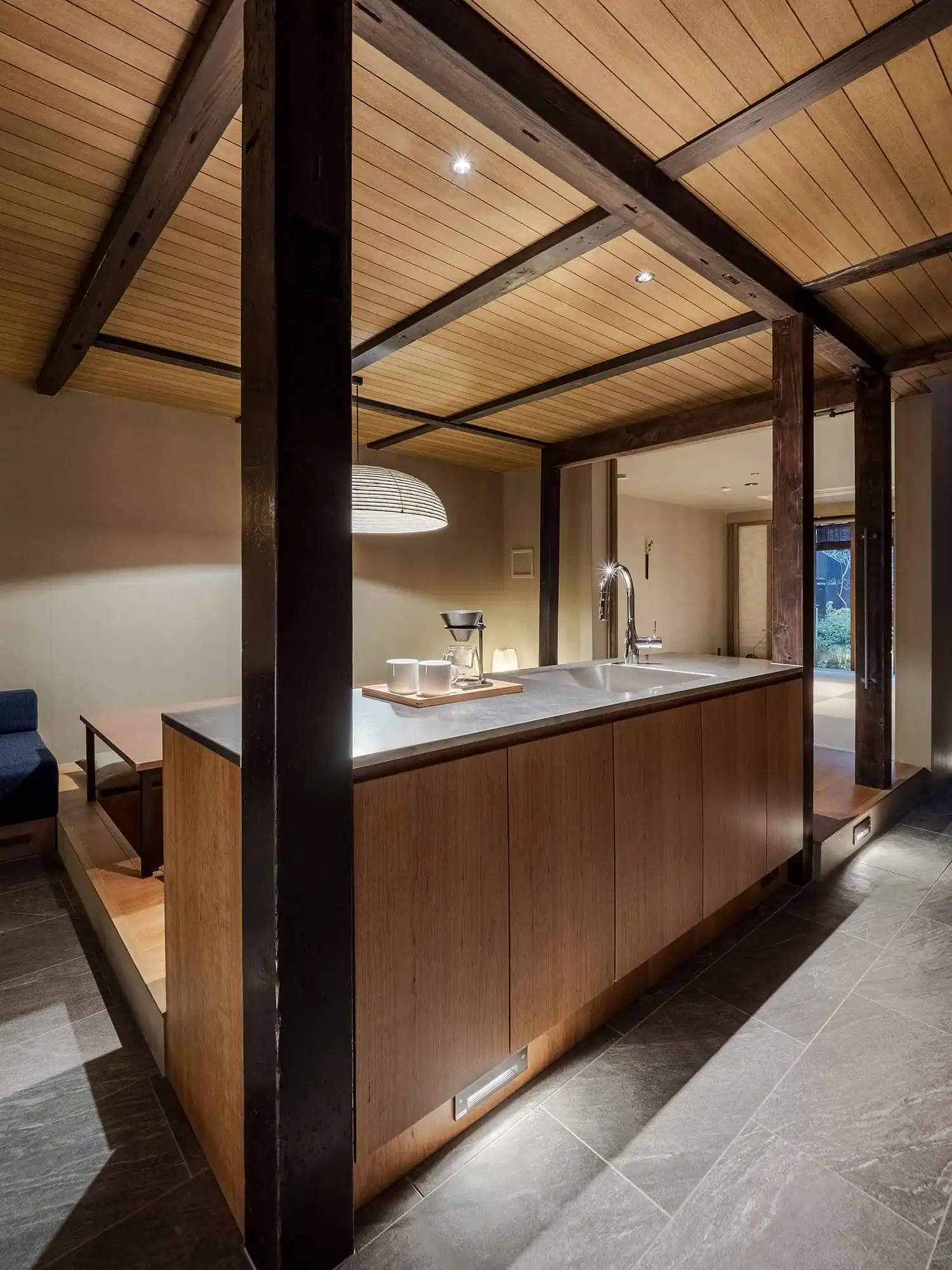 While the exterior may appear compact, sliding open the wooden door reveals a spacious interior that can comfortably accommodate up to 9 guests. Relax in the traditional misenoma tatami area or on the sofa seating with a TV, enjoy a soak in the hinoki cypress wood bathtub, and unwind in the tatami-lined washitsu room overlooking the Japanese garden. A dining table with recessed leg space offers comfortable seating, and the modern kitchen is fully equipped for meal preparation. High ceilings and a skylight brighten the home with natural light throughout the day.