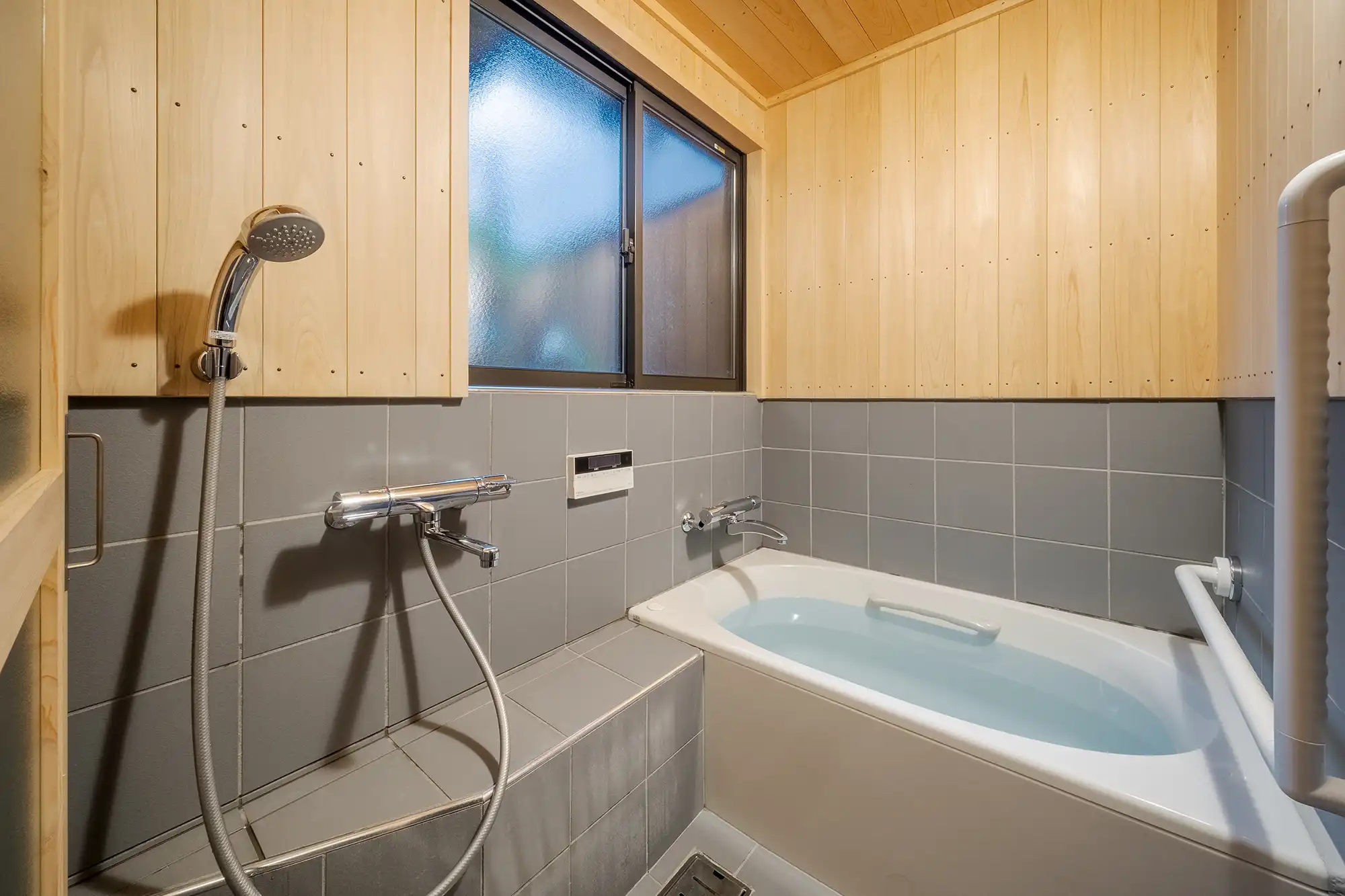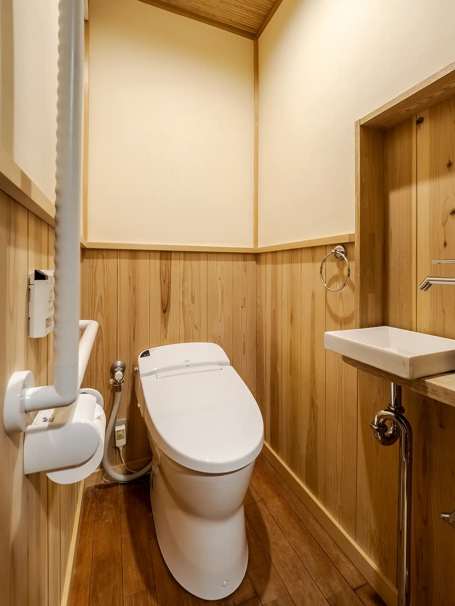 Slide open the lattice door to reveal an interior designed with earthen walls, intricate woodwork, and ‘shoji’ paper doors. The 1F Japanese room is lined with ‘tatami’ flooring, as is the perfect place to admire the inner garden.The bathroom is enveloped in hinoki wood and also features a stone tiled bathtub. (The Japanese room can be converted into a sleeping area when more than 2 guests stay here)
