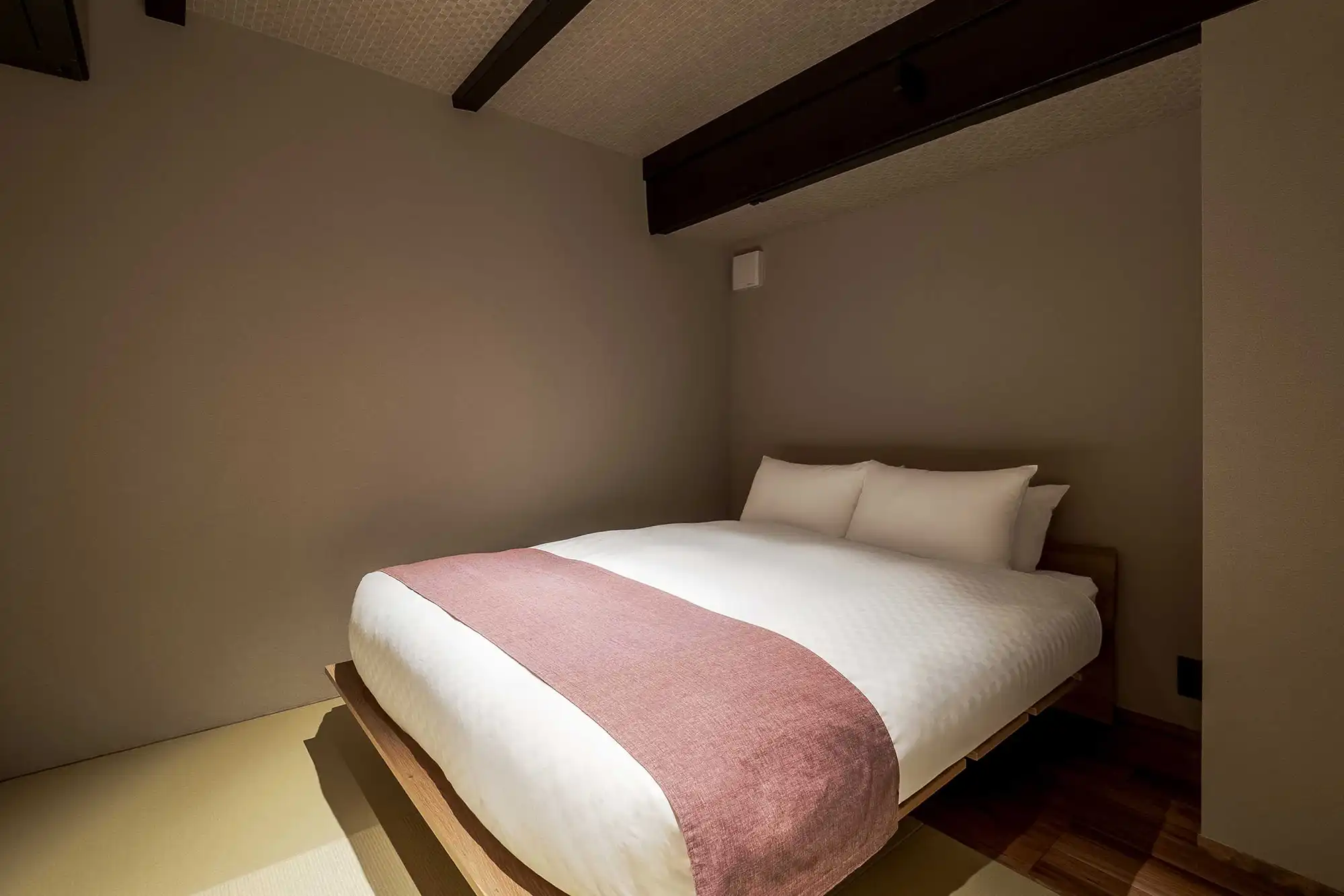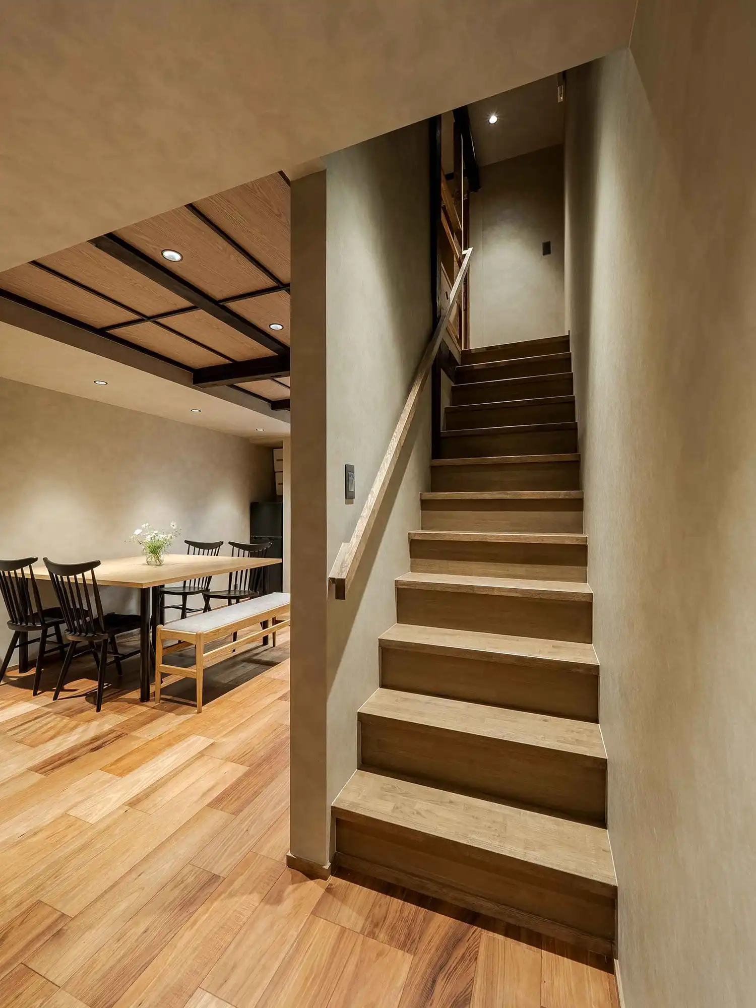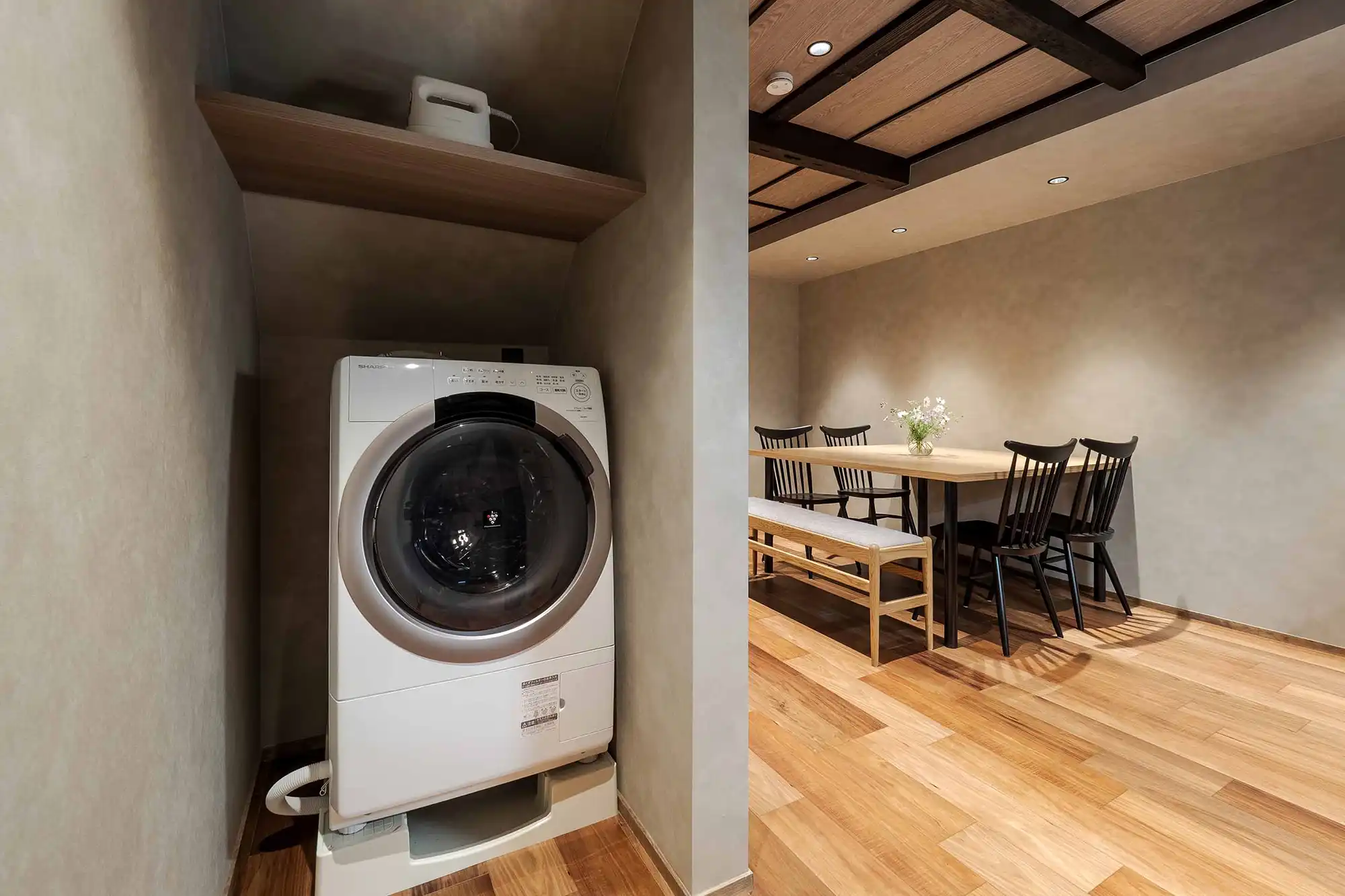 Upstairs, you'll find a classic tatami room perfect for unwinding in traditional Japanese style. Yumeha offers 3 bedrooms to comfortably accommodate your group: one with a double bed, one with two single beds, and a tatami room with futon bedding. For added convenience, the house includes floor heating, a washer-dryer, and bidets on both floors.