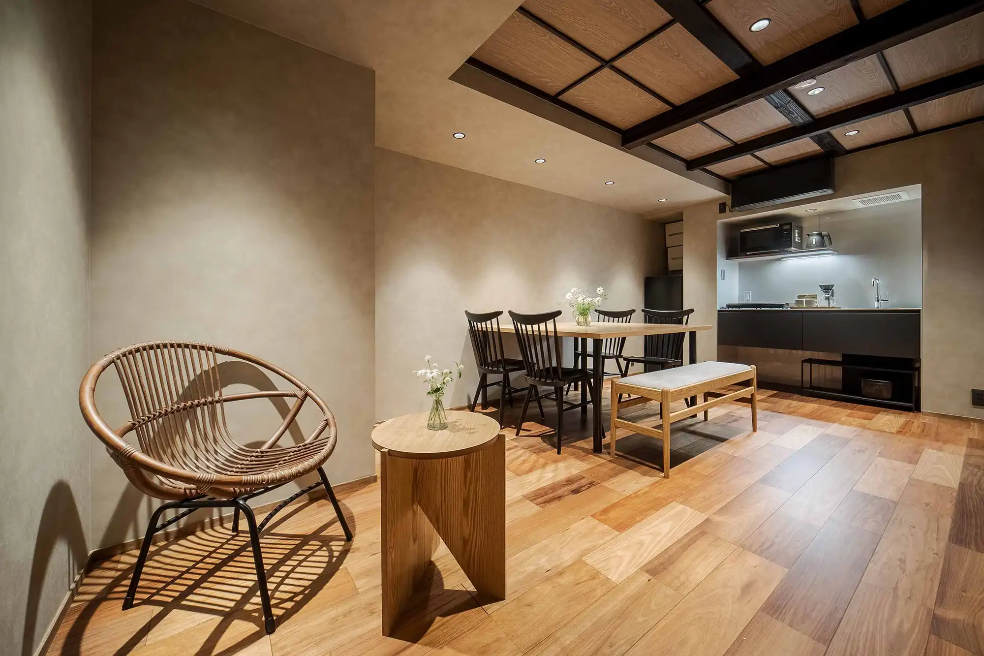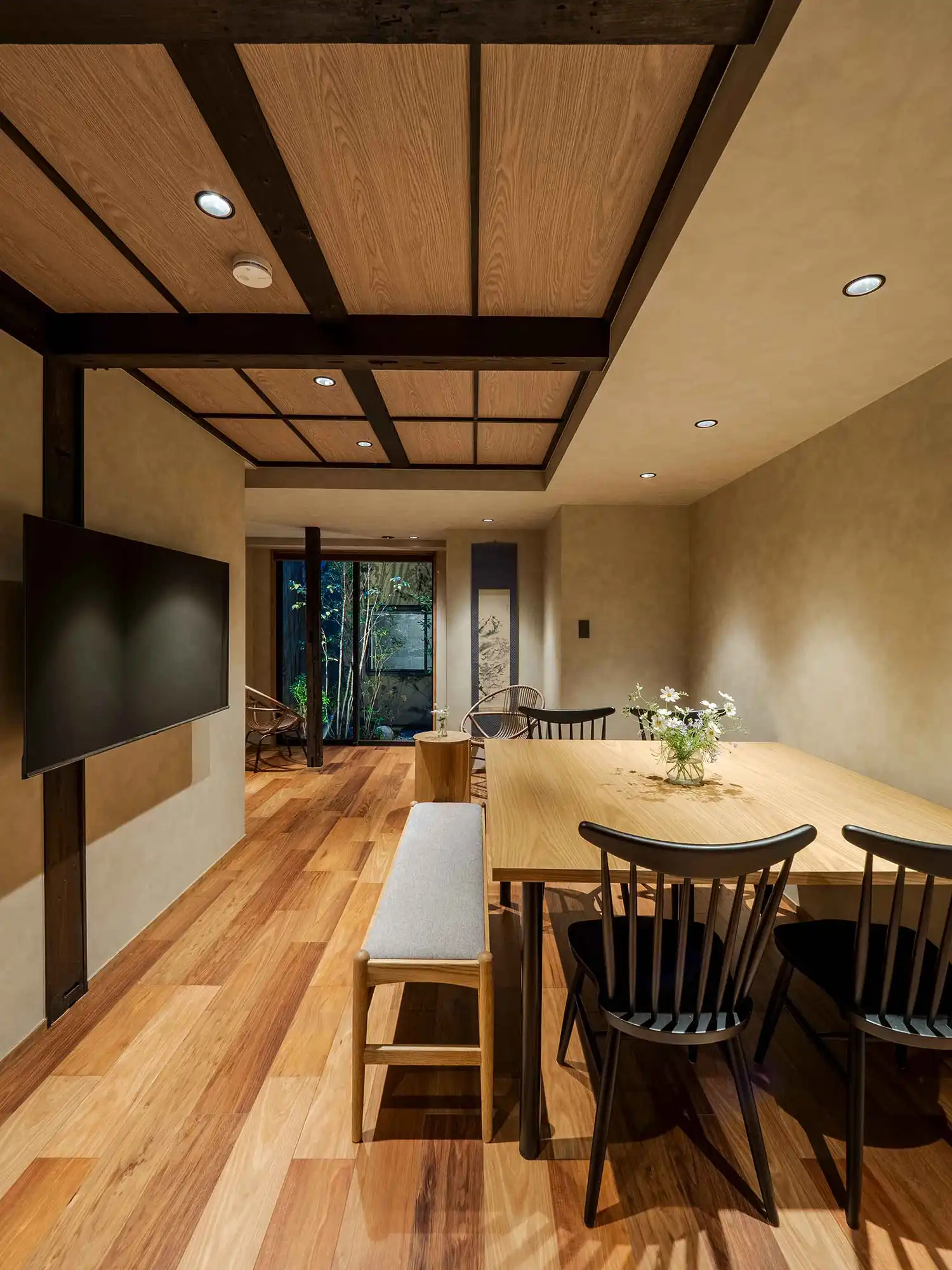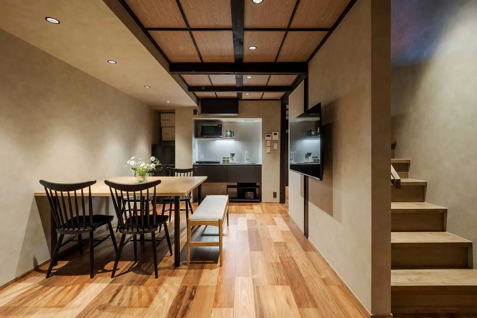Original wooden beams stretch across the ceiling, connecting you to over a century of history. The living-dining room offers views of a Japanese garden, where you can admire the tsuboniwa greenery and traditional kakejiku scroll art. The spacious kitchen comes fully equipped for your stay, while the bathroom features a soaking tub with views of the garden and a waterfall shower head.