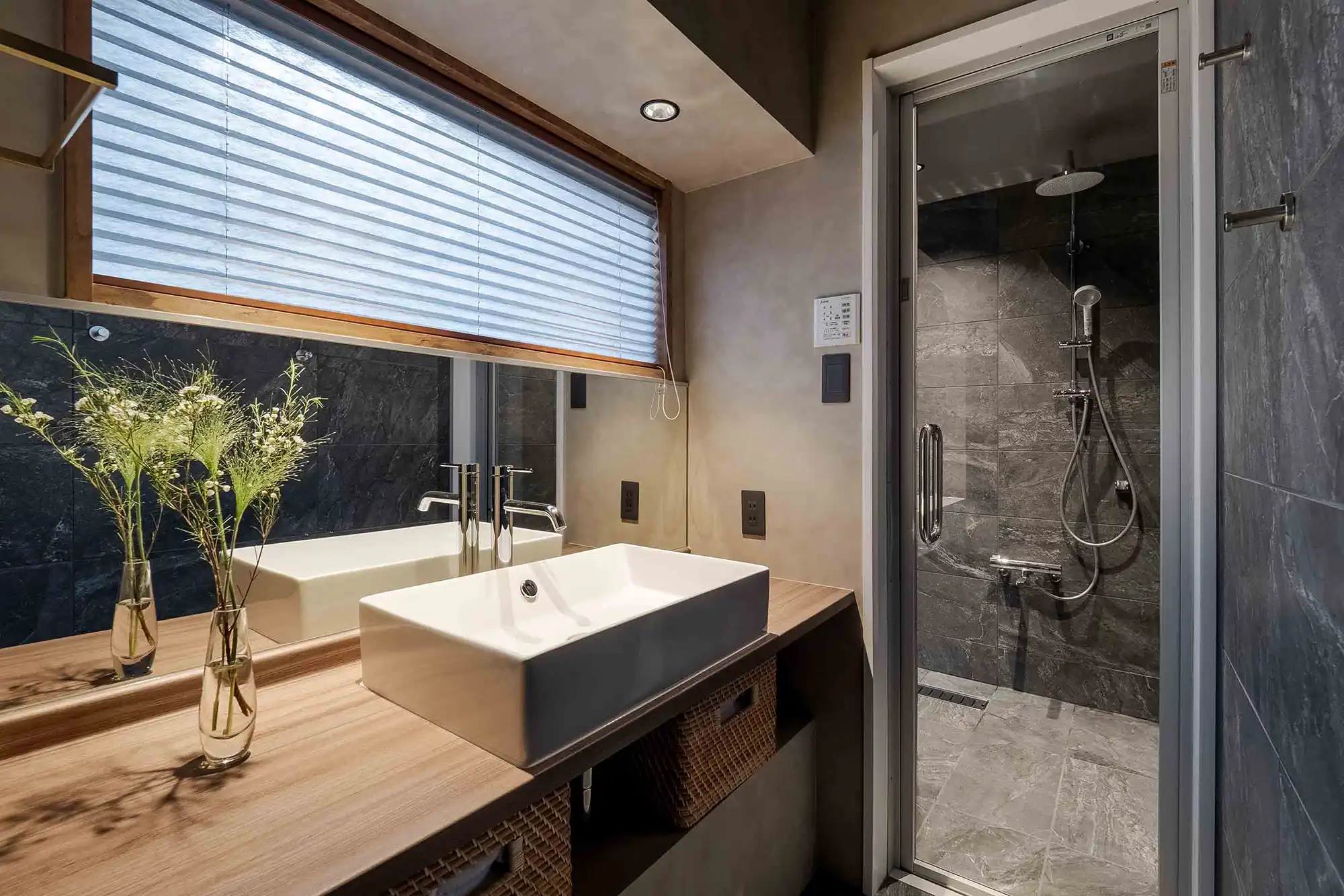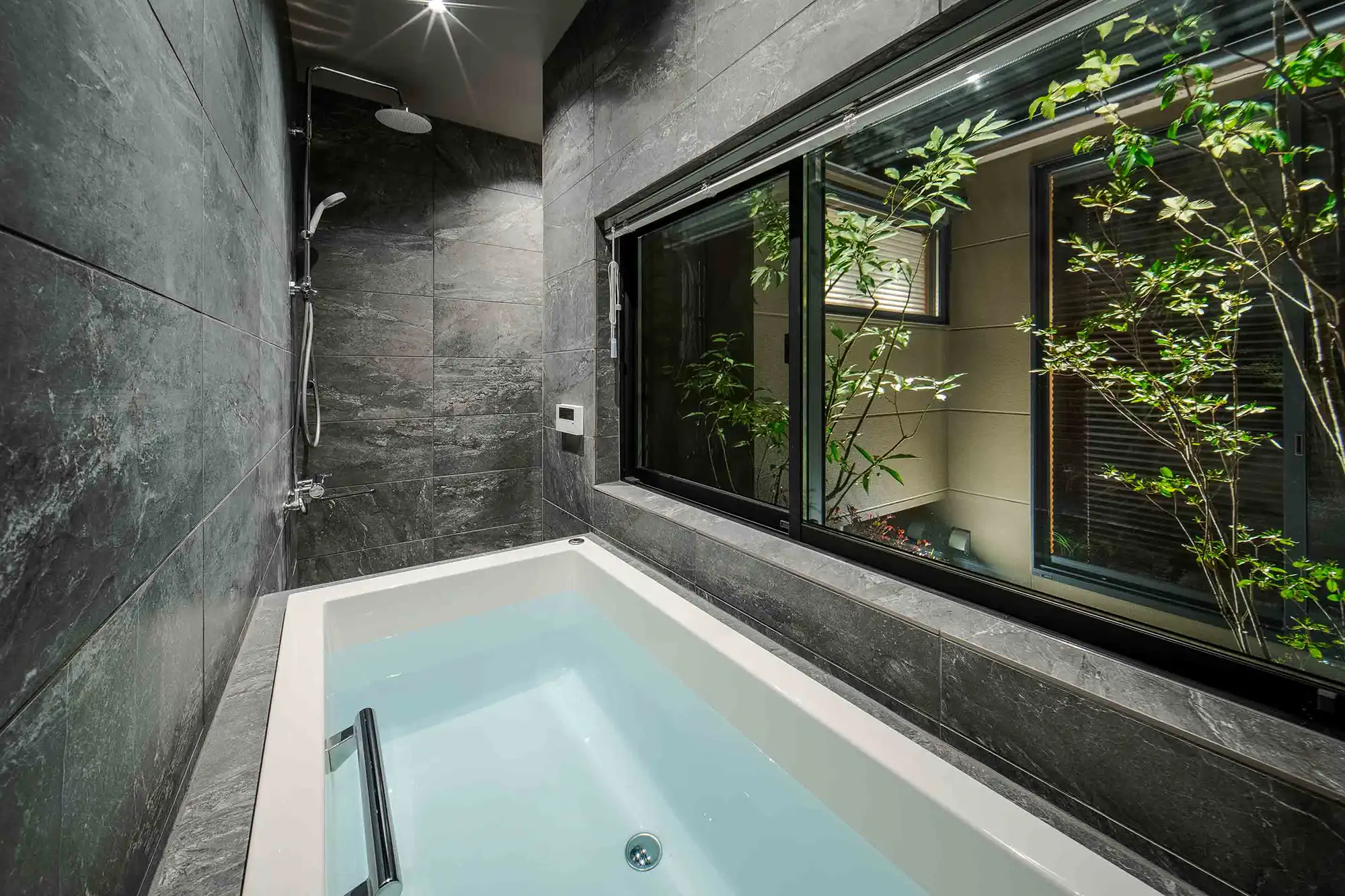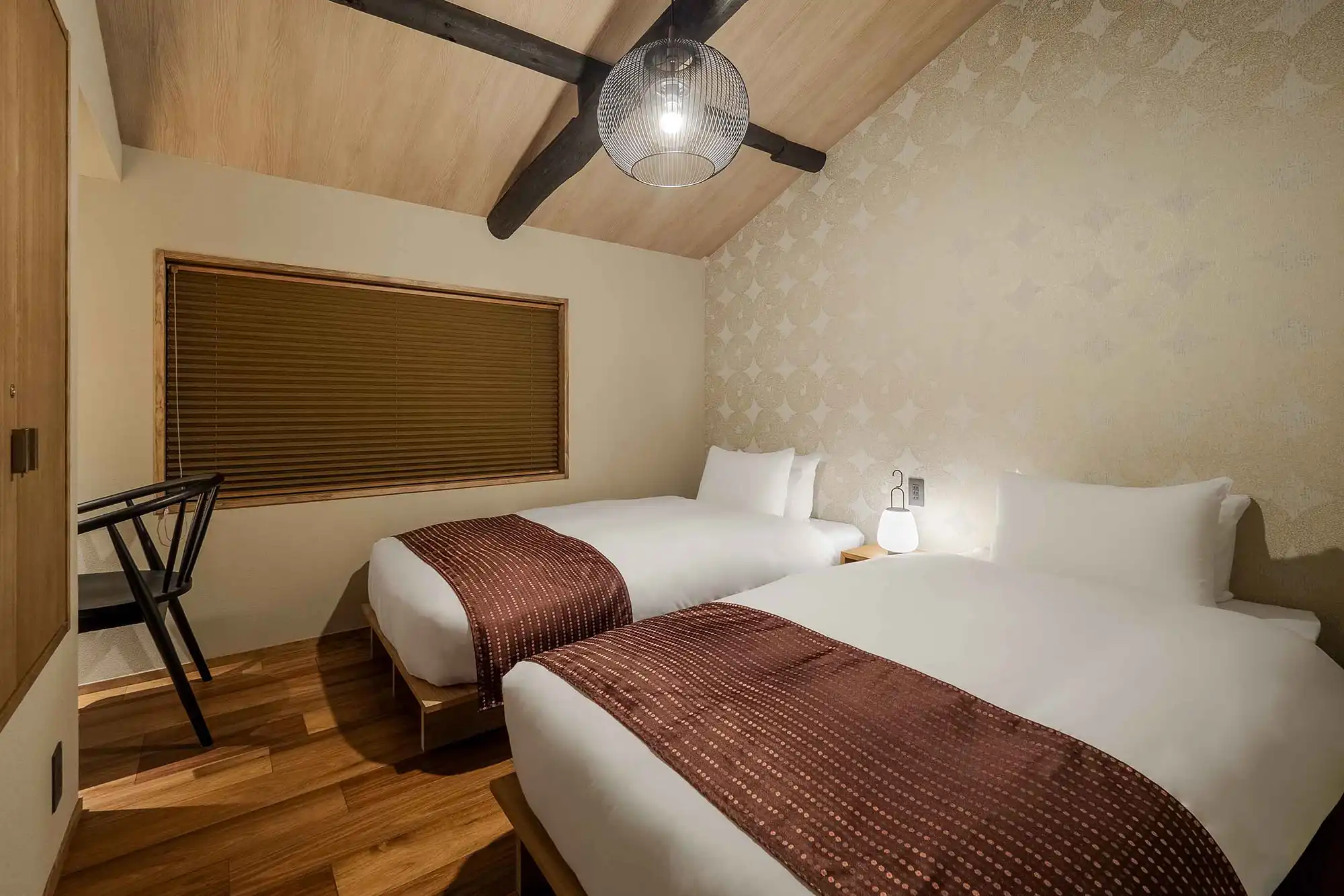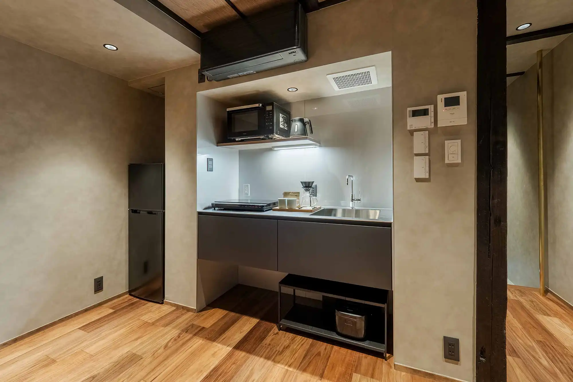 Original wooden beams stretch across the ceiling, connecting you to over a century of history. The living-dining room offers views of a Japanese garden, where you can admire the tsuboniwa greenery and traditional kakejiku scroll art. The spacious kitchen comes fully equipped for your stay, while the bathroom features a soaking tub with views of the garden and a waterfall shower head.