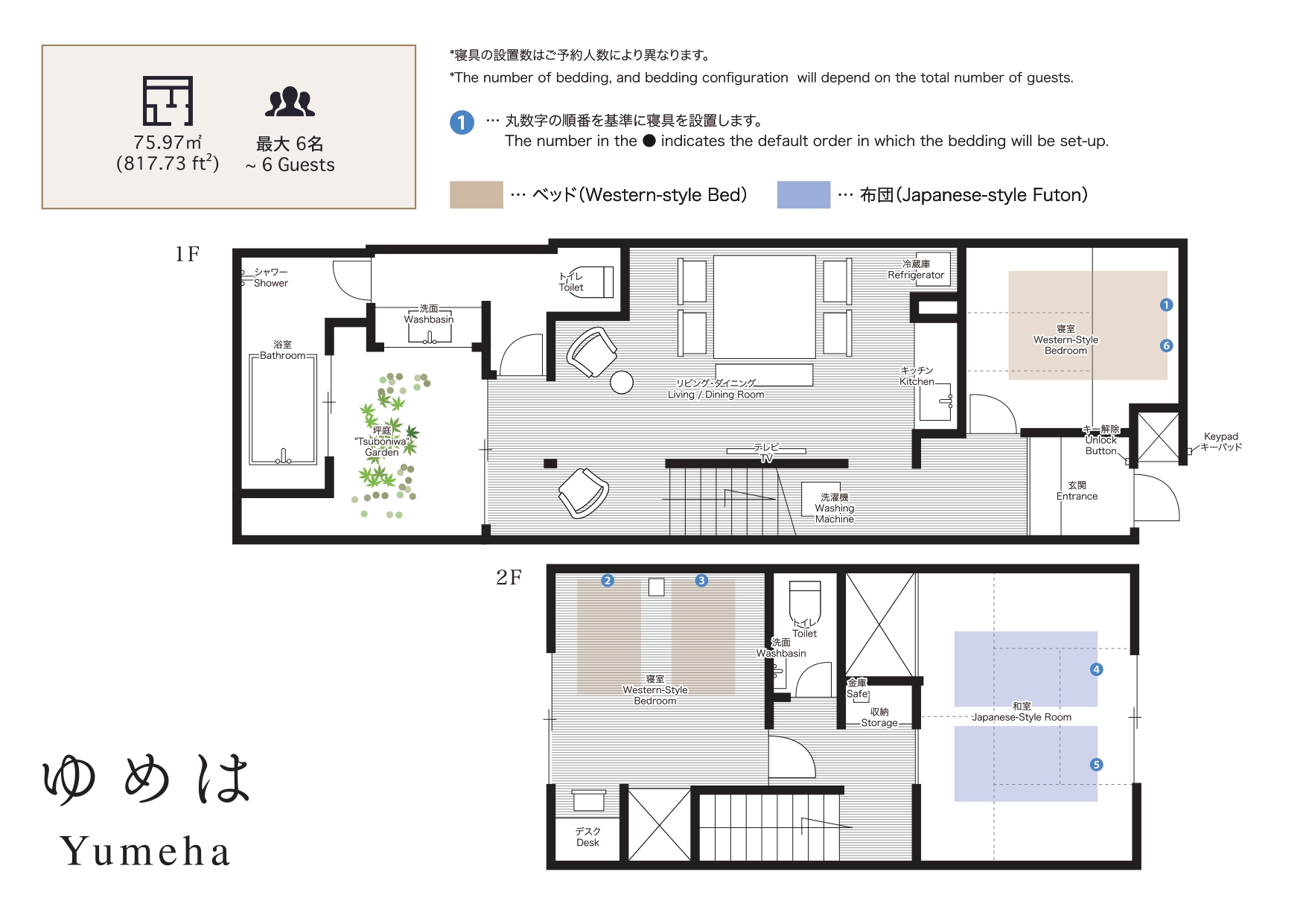 Please take a look at the floor plan for details on what beddings are available in this house (as it will differ depending on each house). To make a request for a specific bedding set-up, you must contact MACHIYA RESIDENCE INN at least 2 days before your check-in date. Up to 2 children (5-years-old and younger) staying under our “Children’s Policy” will be required to share a bedding with another guests.