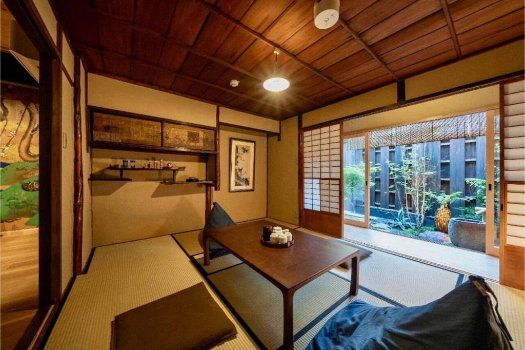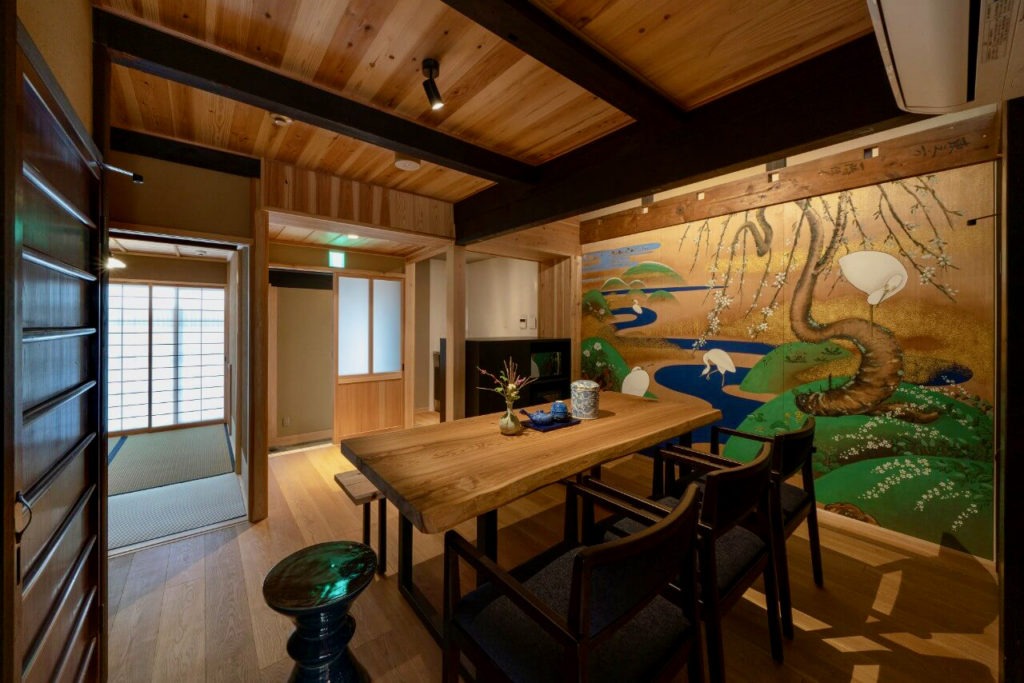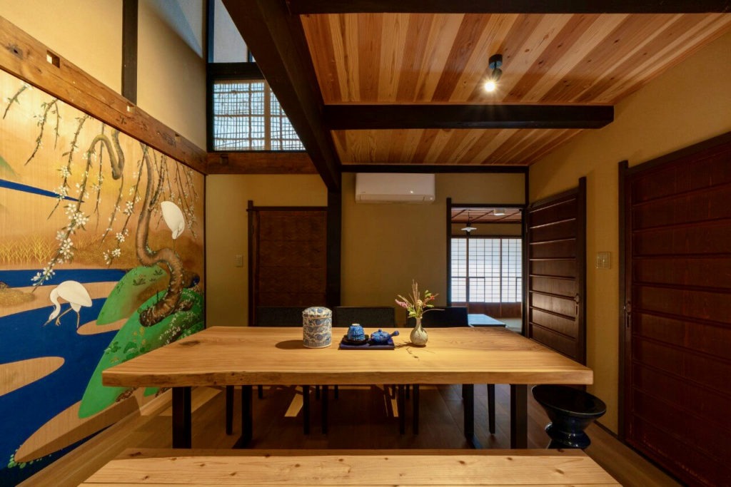 京都「祇園」の中心、「三条駅」徒歩5分。伏見稲荷までアクセス抜群。雄大な川と白鷺が描かれたリビングや坪庭が美しい町家。