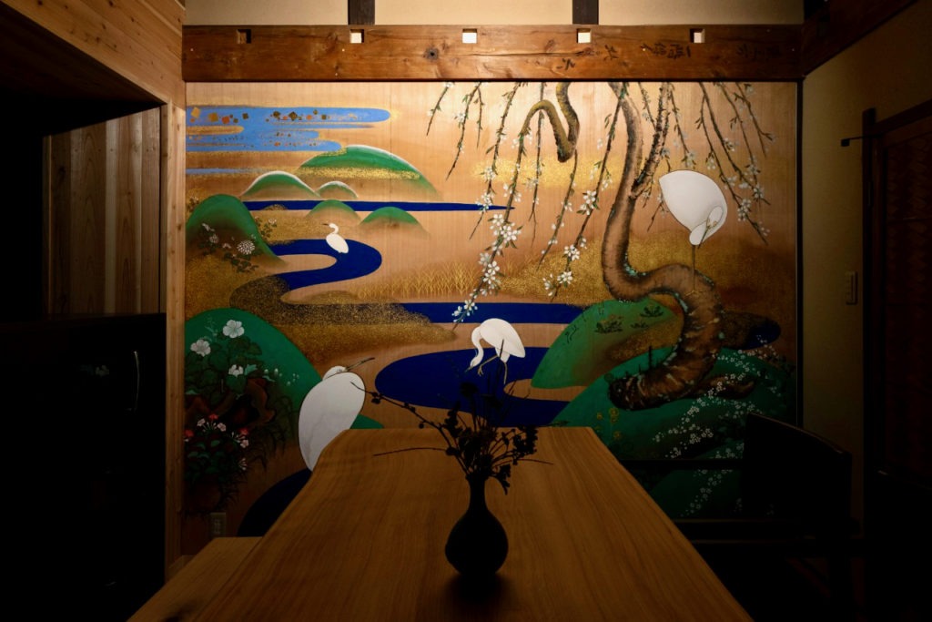 伝統的技法で描かれたきらびやかな日本画が映える町家