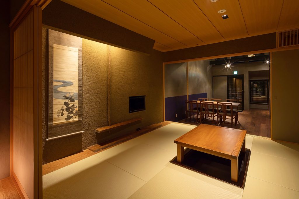 町家の奥には、坪庭を見渡せる純和室の居間。居間の土壁は「掻き落し」と呼ばれる技法が使われ、独特の風合いをみせます。この「掻き落し」は左官仕上げの一種で串やブラシなどで土壁の表面を引っ掻いて、壁に凸凹を作ったもの。左官職人久住有生氏によるもので、久住氏は現代に和の伝統を伝える職人として日本の重要文化財の修復や海外でも活躍されています。