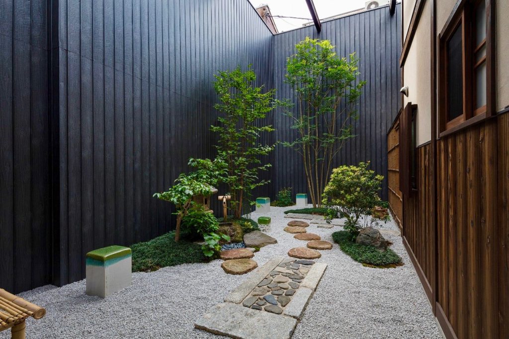 石灯籠、様々な形の飛び石、木々が美しく配され、白い砂利で覆われた一棟貸し町家宿「雅樂庵 – がらくあん」の坪庭。