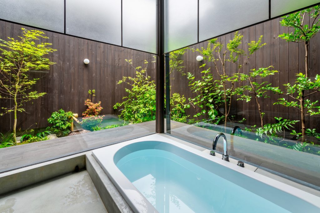 坪庭に面した2方向が全面ガラス張りで、坪庭の緑を間近に露天風呂に入っているような気分が味わえます。夜になると庭がライトアップされ、昼とは違った雰囲気に。お天気の良い日は坪庭に出て、濡れ縁に座ってのんびり日向ぼっこもおすすめです。