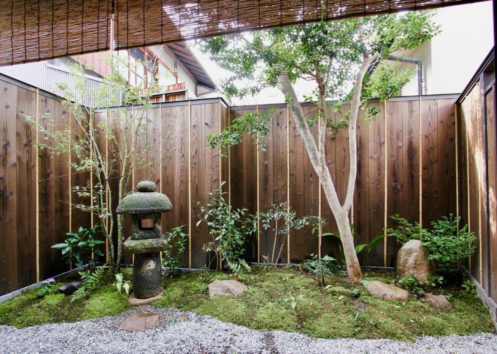 丸い石灯籠が据えられた静寂な雰囲気の漂う坪庭がある町家(町屋) 。