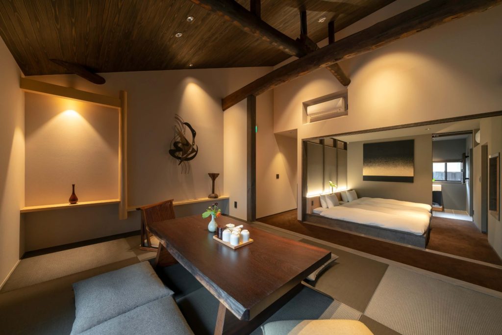 京都「清水寺」「祇園」徒歩圏内の町家宿。居間と寝室がひとつづきの開放的な空間設計。
