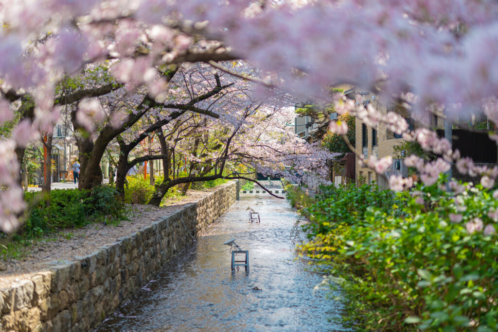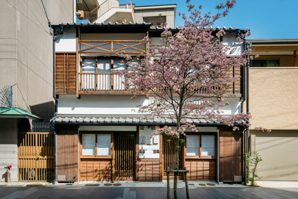 京都の鴨川の西側沿いに流れる「高瀬川」。その目の前に、2棟隣り合わせで佇む一棟貸し町家「町家レジデンスイン京都 花篝 – はなかがり」「町家レジデンスイン京都 花衣 – はなごろも」では、美しい桜を眺めながらの町家滞在を楽しめます。