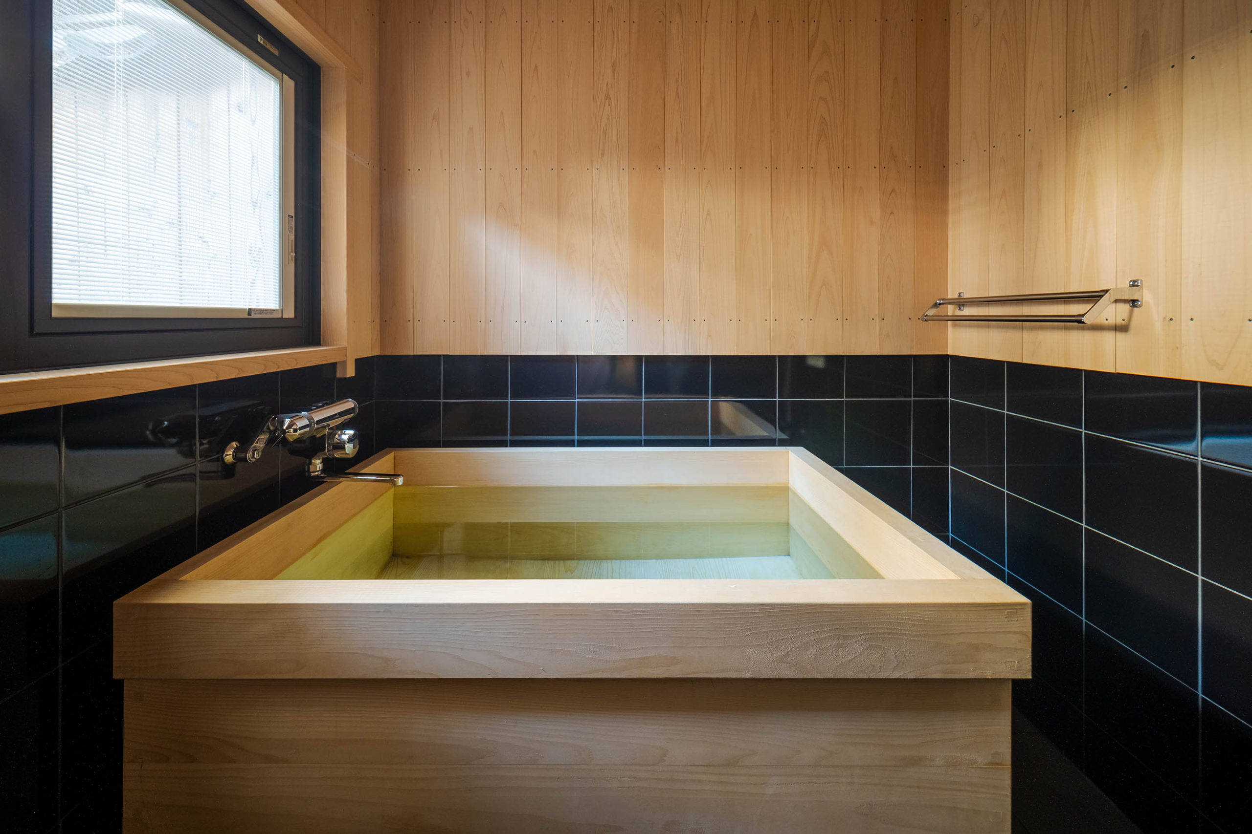 格子の隙間から外からの光が感じられるリビング、ヒノキの湯船が清々しい趣の浴室など木材の持つ柔らかさや温かさに満ちた空間。2階の寝室では町家の歴史を感じさせる昔ながらの梁をゆったり眺めながら、お休みいただけます。