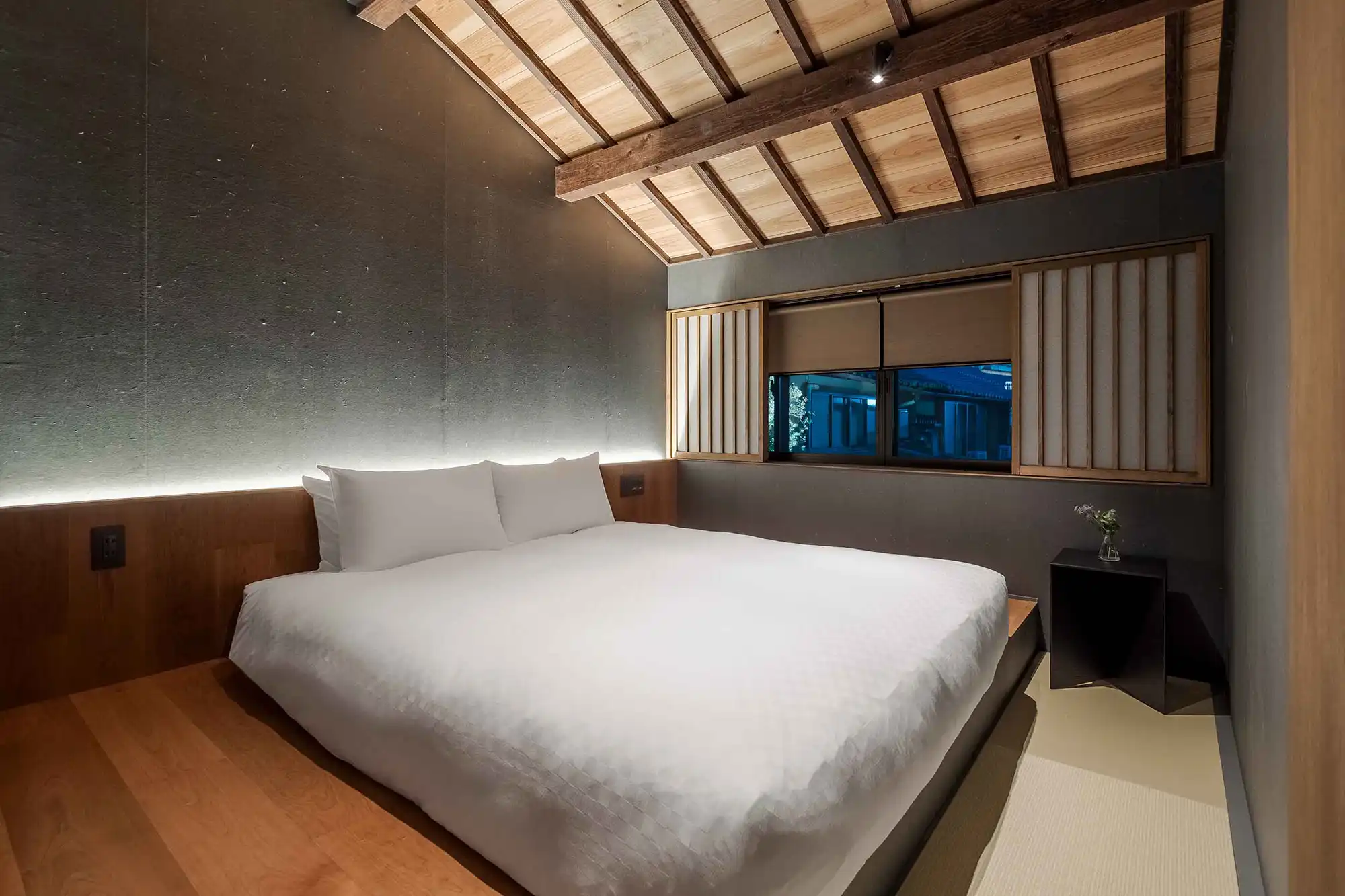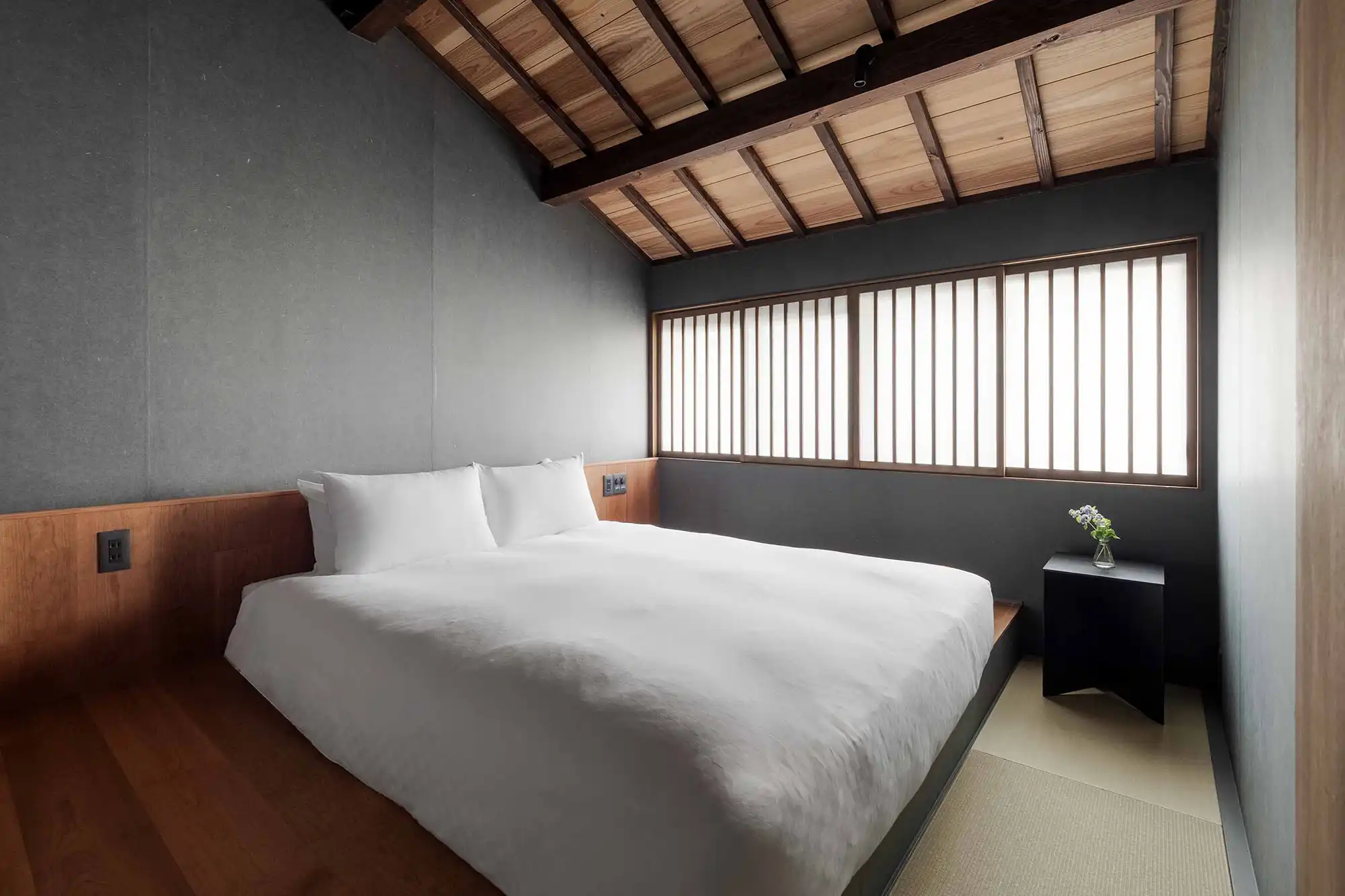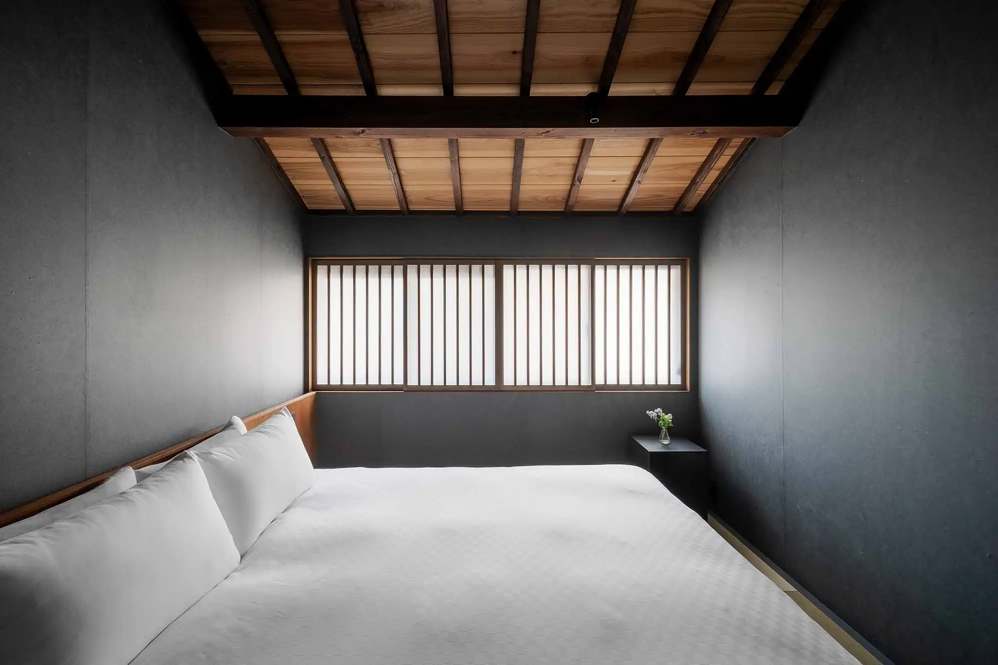 • みつな 〈一棟貸し町家〉 2F 洋寝室 障子窓からやわらかな光が届く洋寝室。畳と木ならではの温もりを感じながら、広々としたクイーンベッドでゆったりとおやすみいただけます。