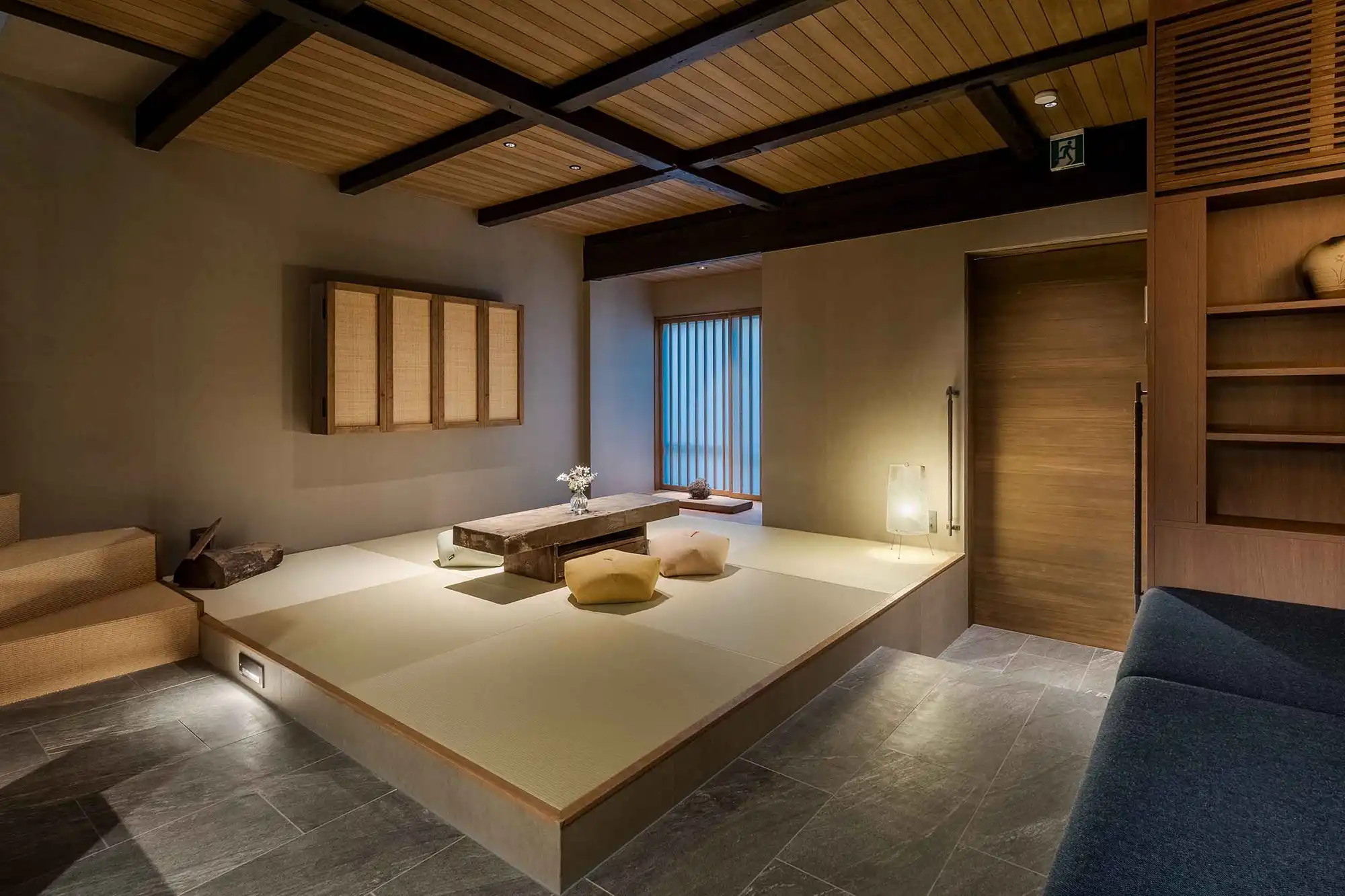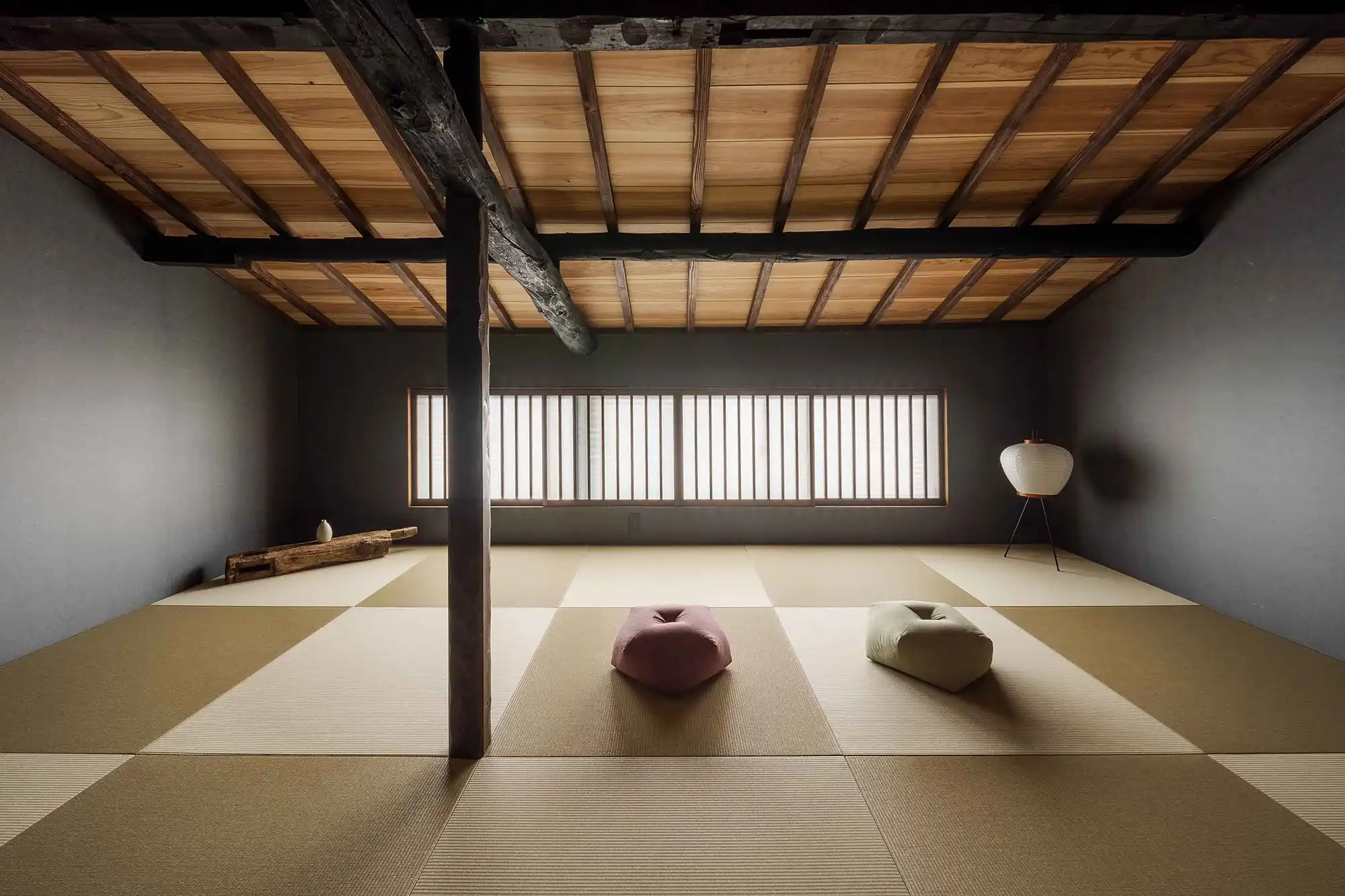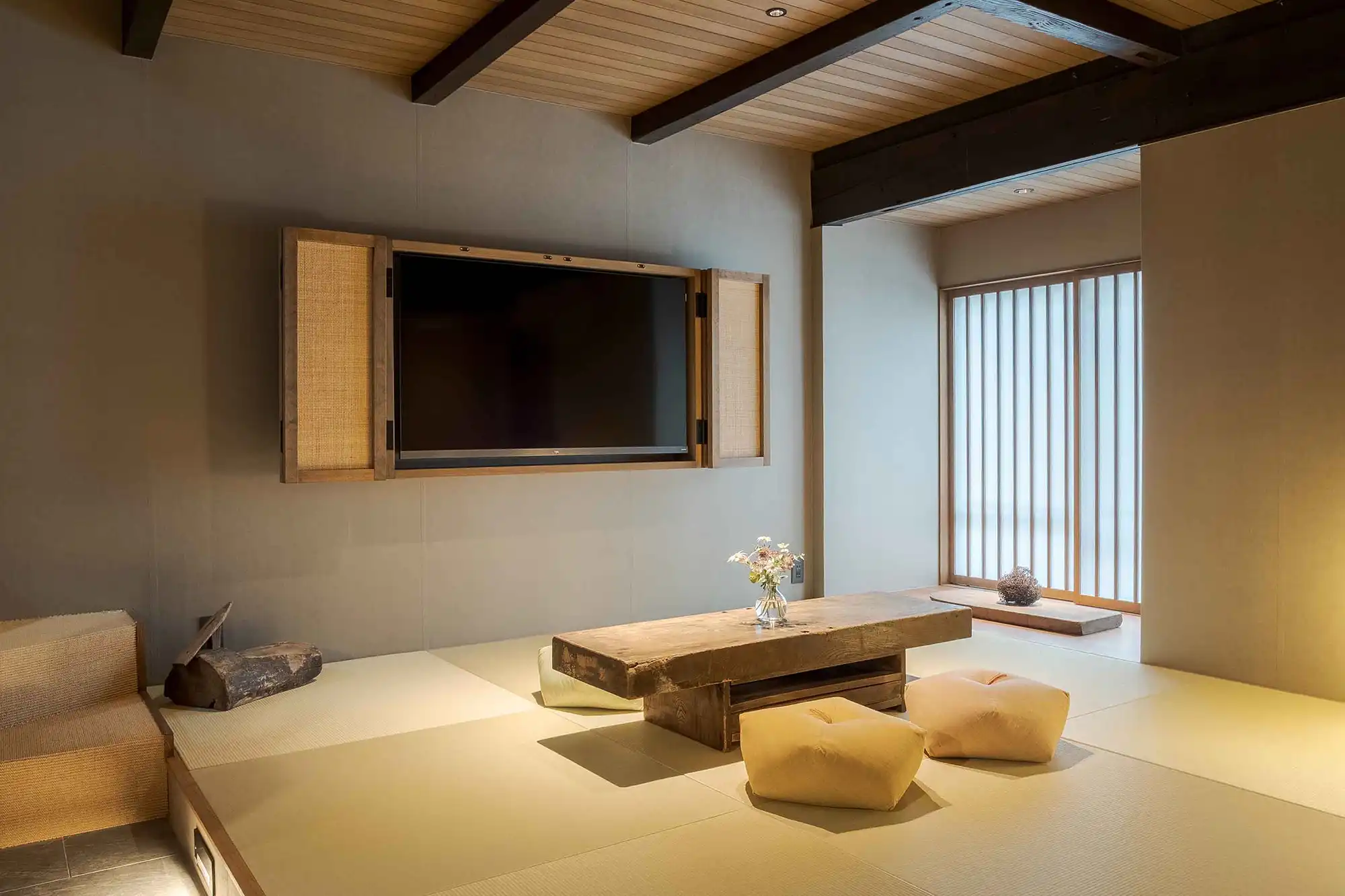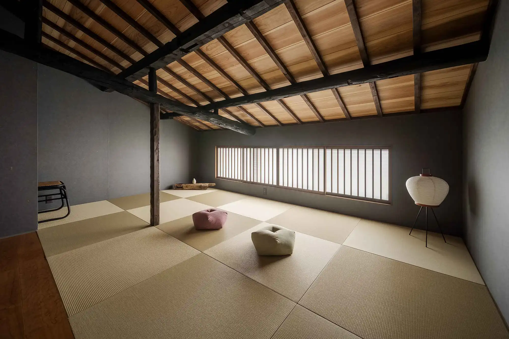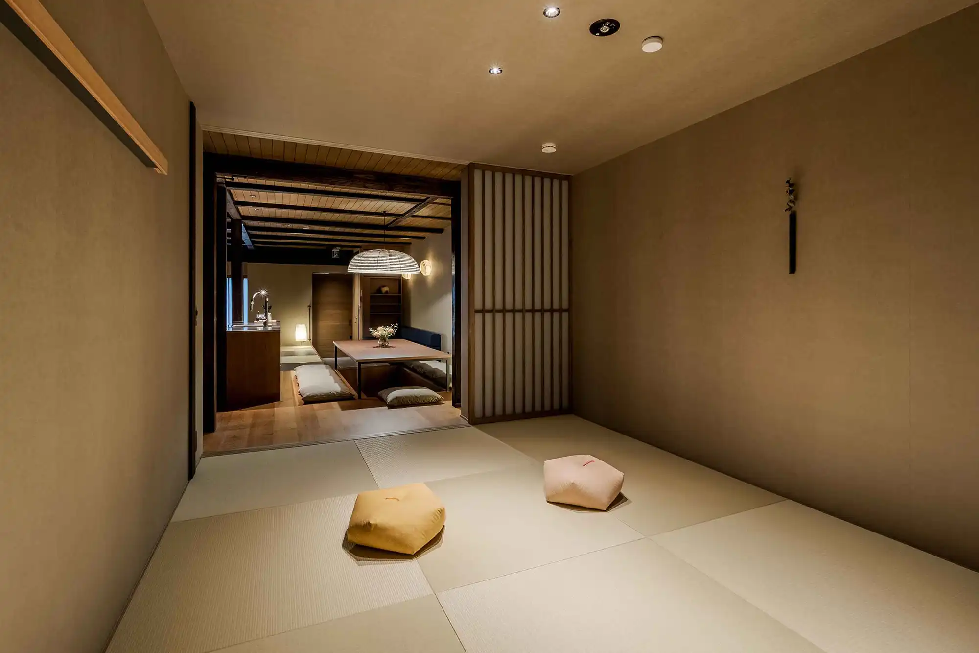 • みつな 〈一棟貸し町家〉 1F リビング かつての町家の”見世の間”の趣が残るリビング。畳の上でくつろぎながら、町家ならではの落ち着いた寛ぎを味わっていただけます。