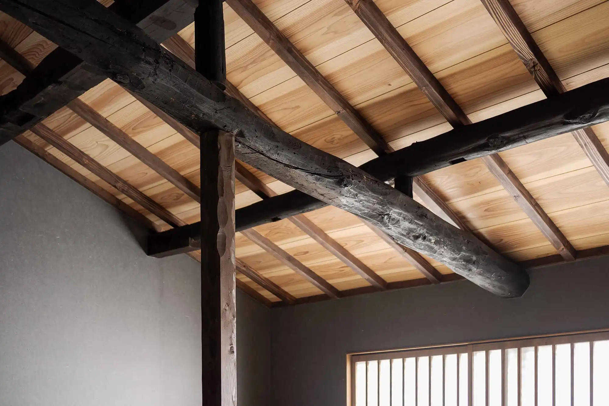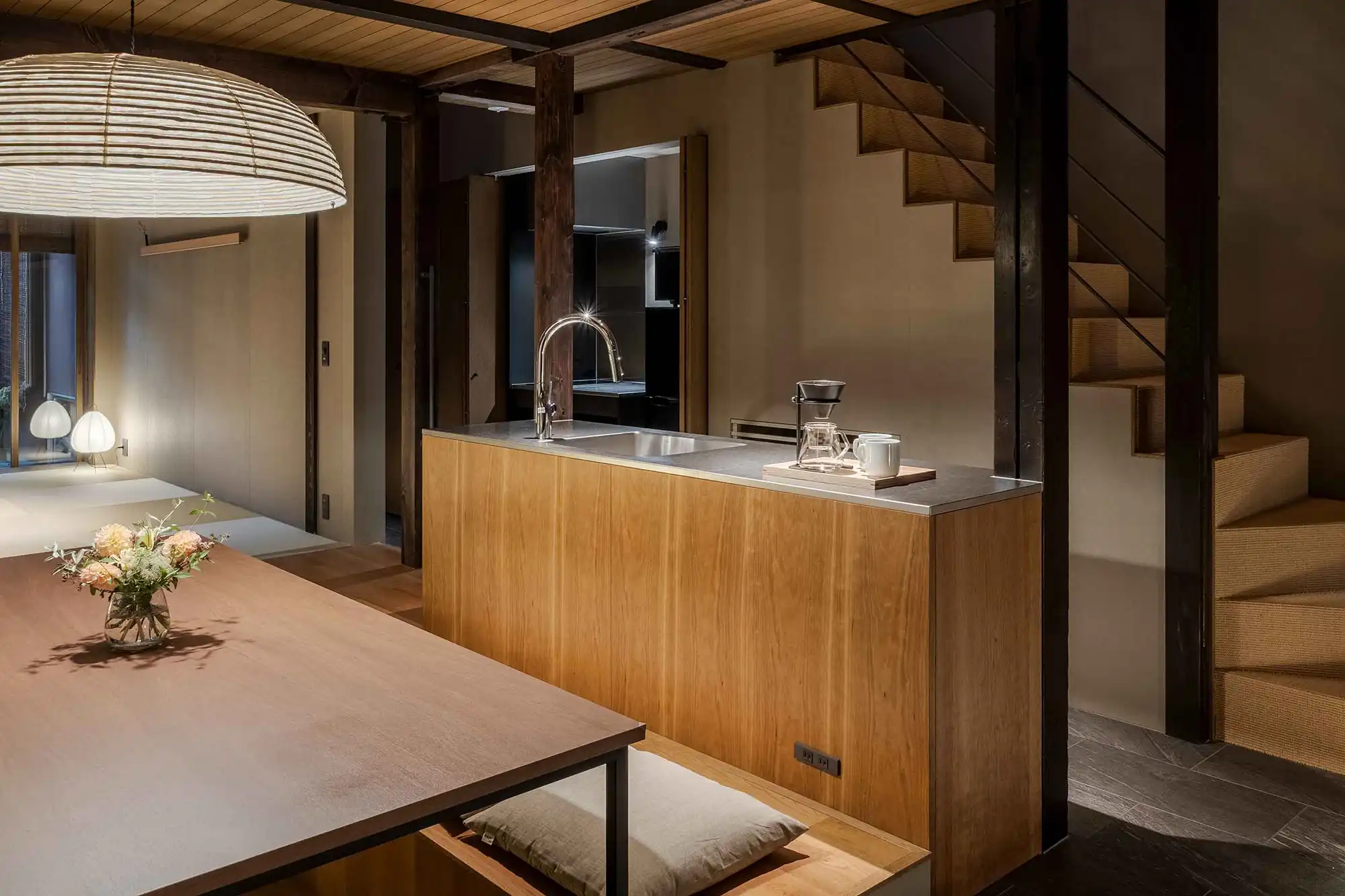 軒高を抑えた特徴的な2階がある厨子二階(つしにかい)の町家です。中二階とも呼ばれる建築様式は、日本が大きく変革した江戸から明治時代に建てられた歴史を持ちます。“いけず石”が立てられた町家の玄関をくぐると、見世の間から奥の坪庭まで続く、京町家ならではのうなぎの寝床の構造を活かした、一体感あふれるゆったりとした空間が広がります。1階には、畳とソファで寛げるリビング、オープンキッチンが開放的なダイニング、坪庭に面した和室やヒノキ風呂の浴室を。2階は、心地よく休まるクイーンベッドの洋寝室と、町家本来の梁が間近に見られる和寝室に加え、シャワールームを完備。家族や友人グループなど大人数でのご旅行も、お部屋を分けながら快適にお過ごしいただけます。