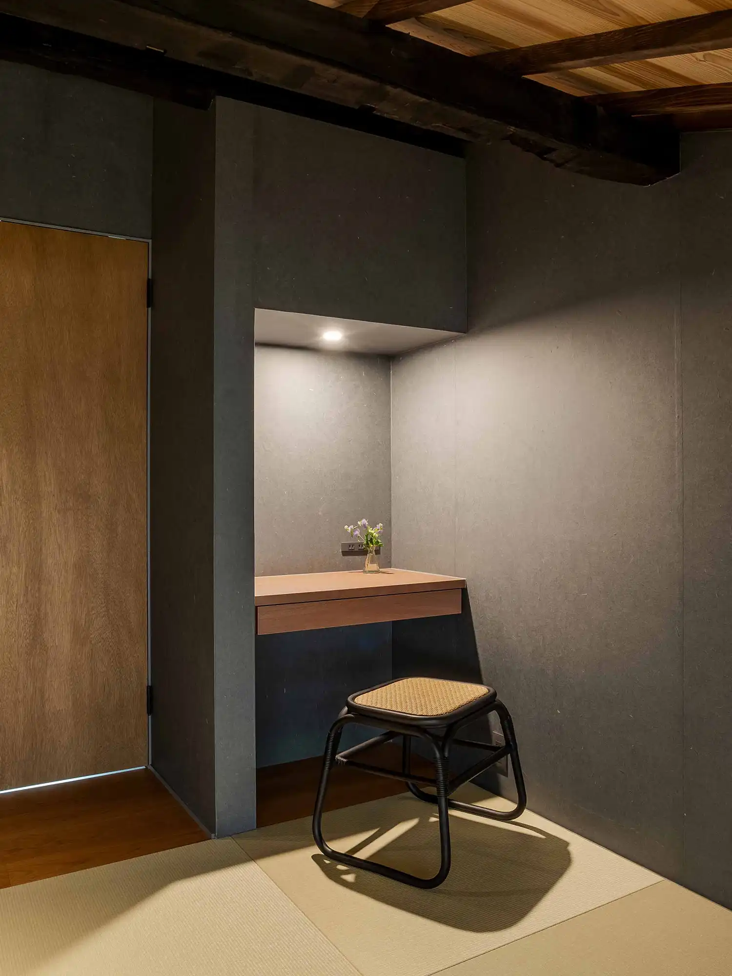 • みつな 〈一棟貸し町家〉 2F 和寝室 伝統的な建築様式・厨子二階の特徴をそのままに残した和寝室。読書や書き物に使えるデスクもあり、和の趣を感じながら寛いでいただけます。