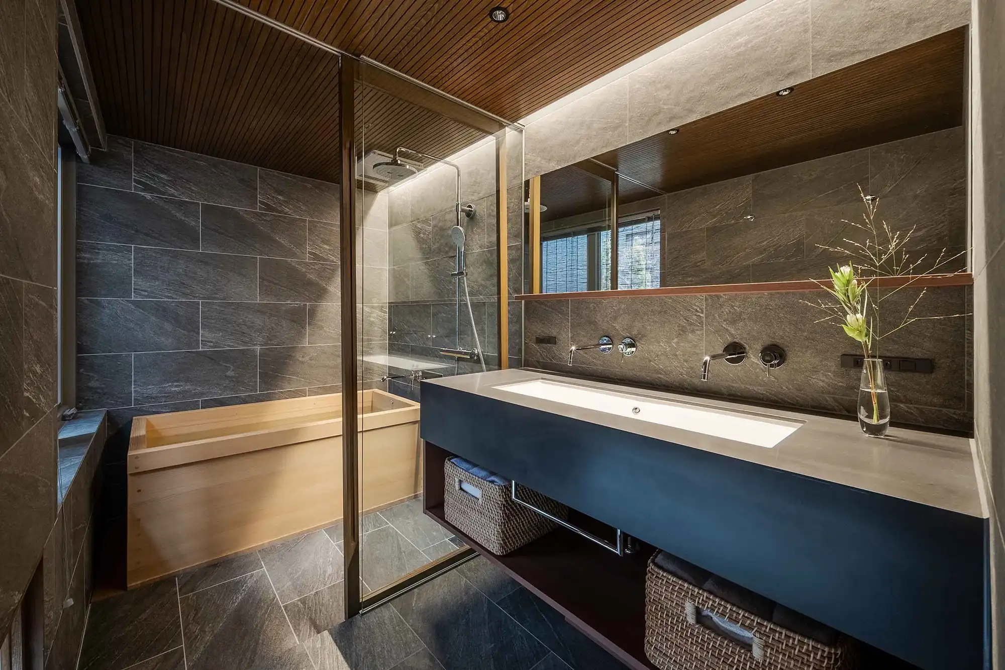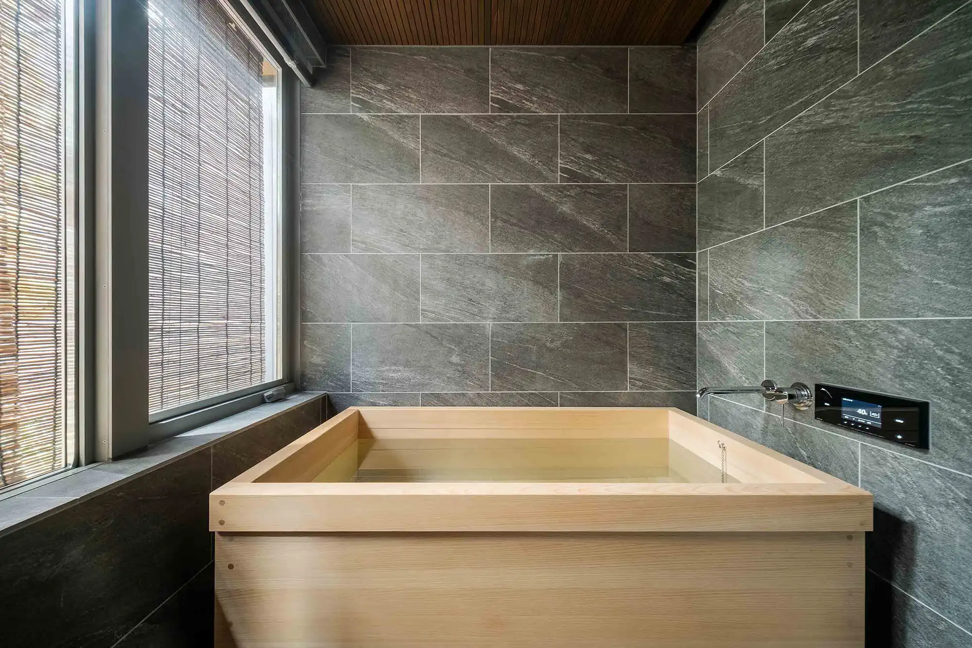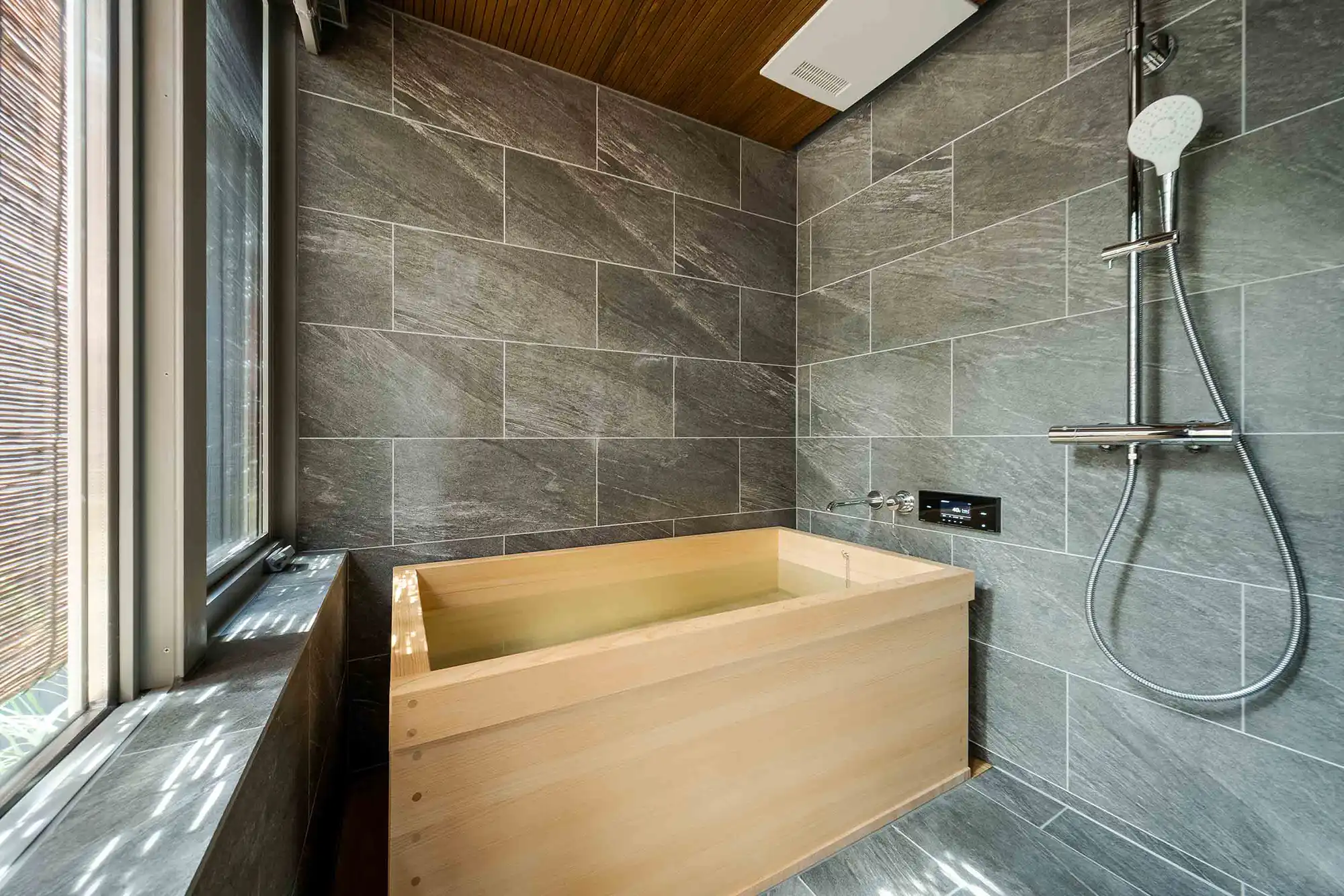 • みつな 〈一棟貸し町家〉 1F 浴室・洗面 ゆったりとしたヒノキ浴槽で、心身ともに癒されるバスタイムを楽しめる浴室。広く使える洗面エリアもあり、朝の支度も時間に追われずスムーズに。
