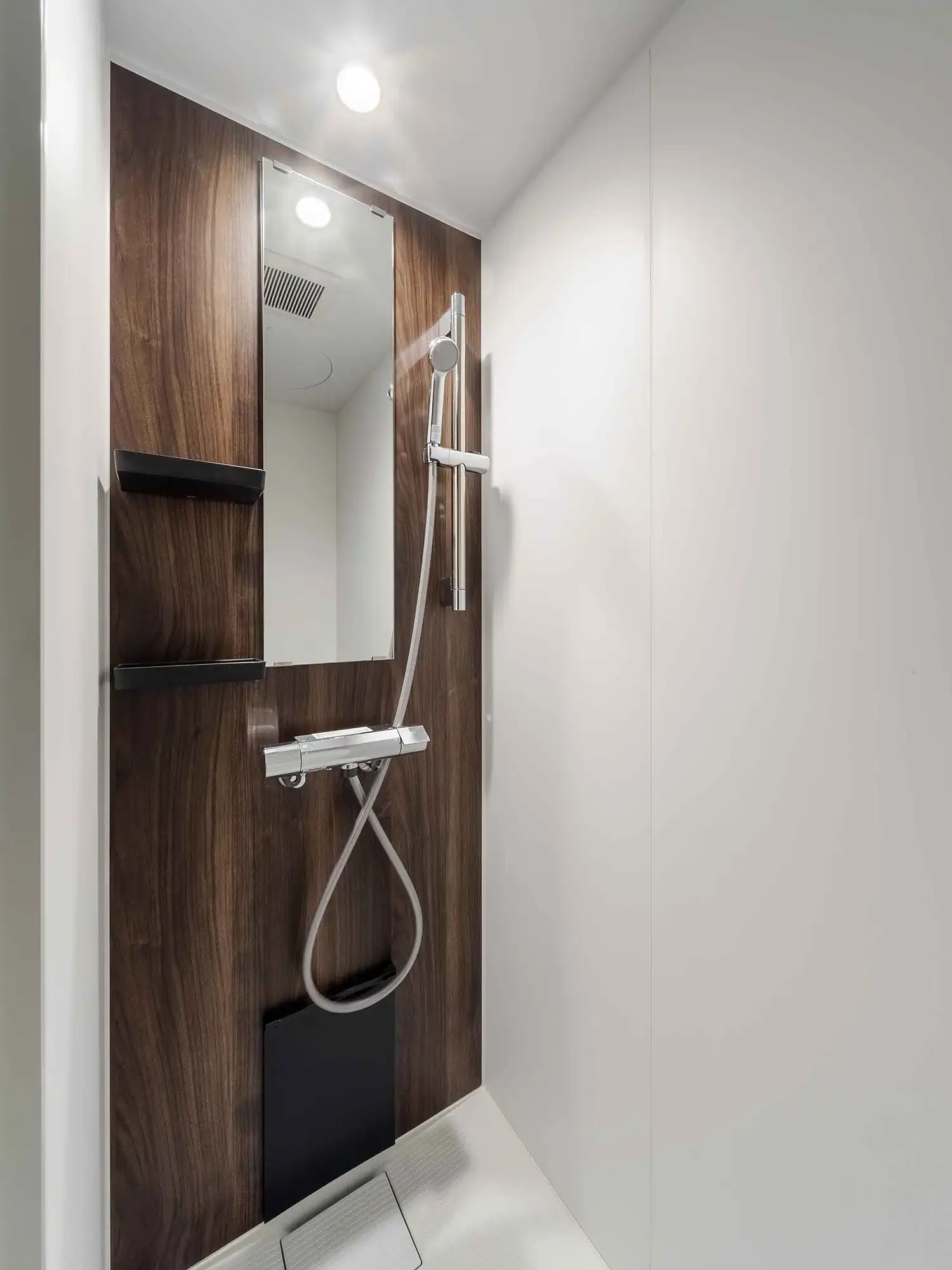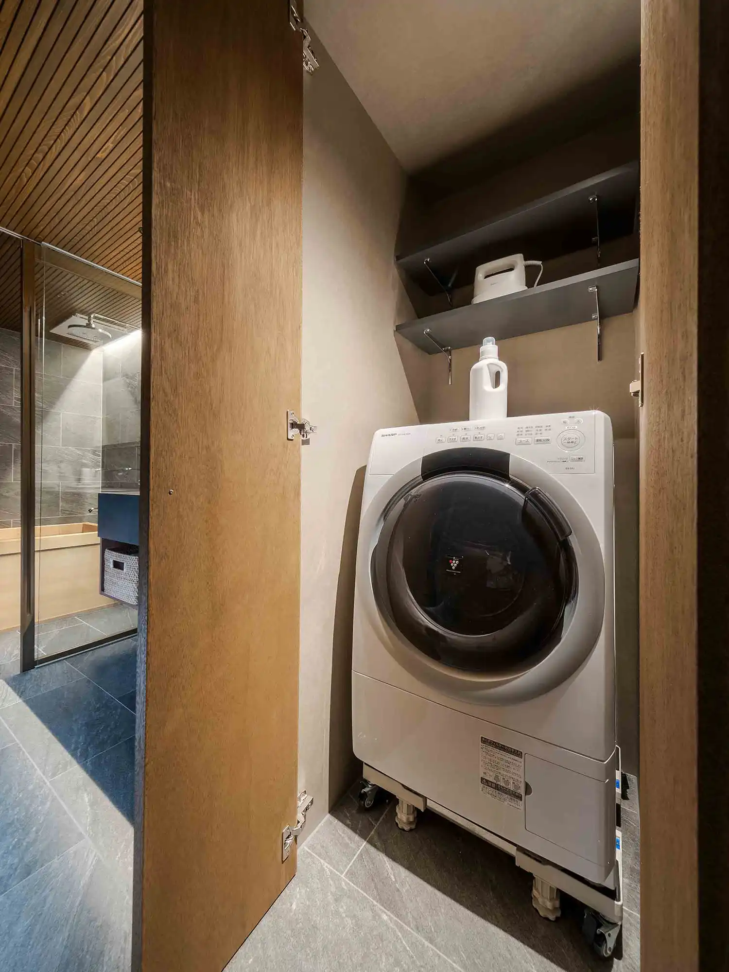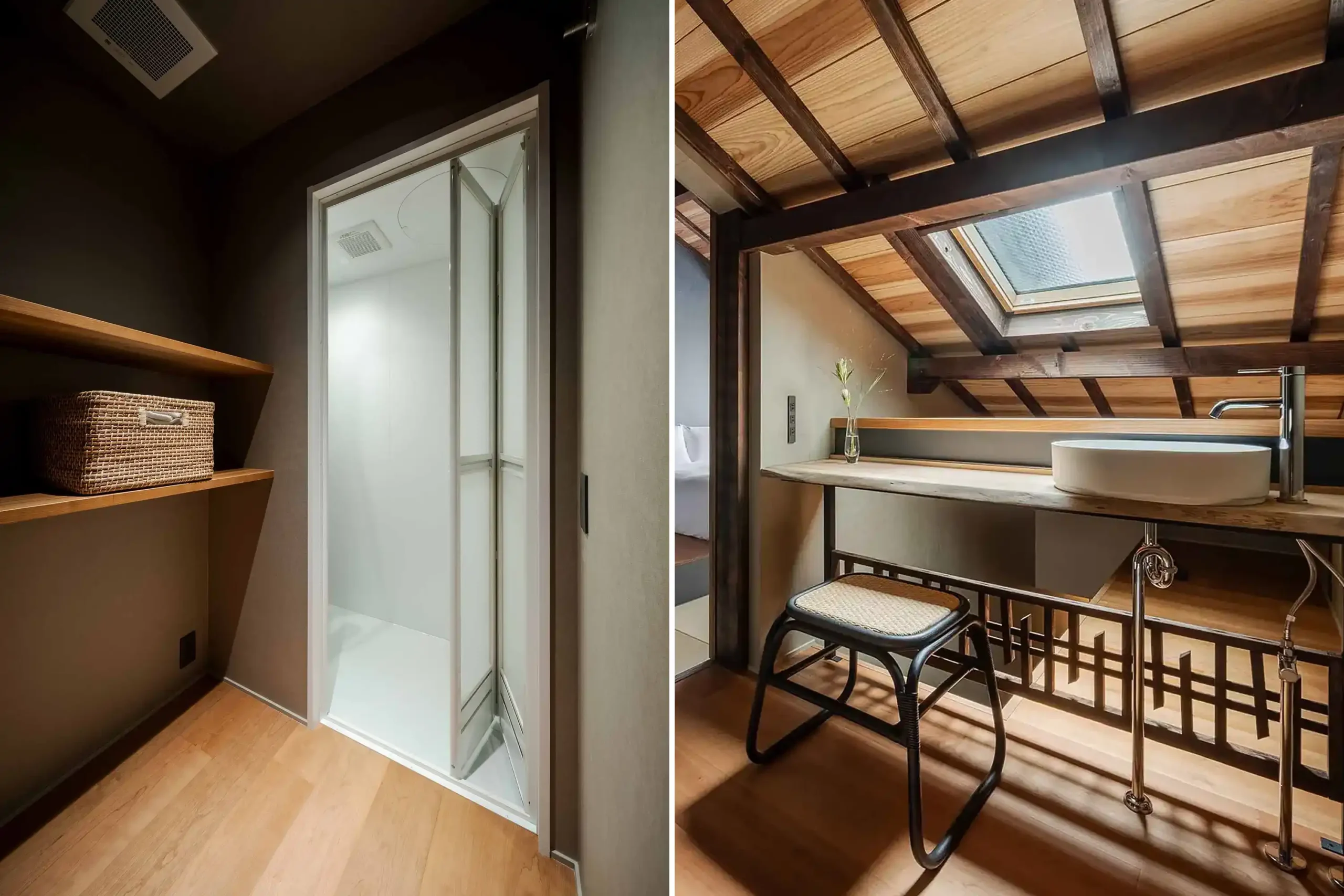 • みつな 〈一棟貸し町家〉 2F シャワールーム・洗面 広く使える脱衣所を備えたシャワールーム。すぐそばには洗面・トイレも備えています。手軽にシャワーを浴びたい時や、大人数でのご宿泊の時の身支度も、上下階に分けて、気兼ねなく快適にお過ごしいただけます。
