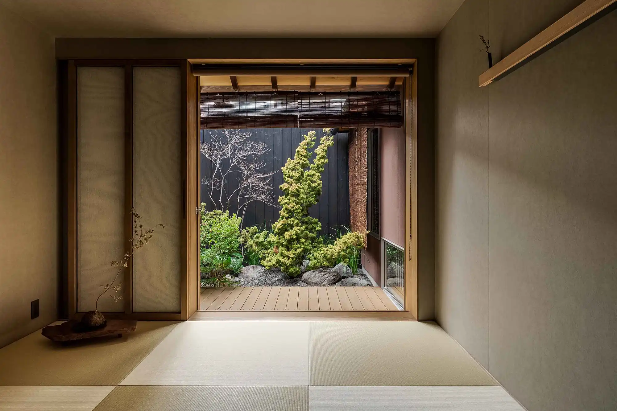 • みつな 〈一棟貸し町家〉 1F 和寝室 坪庭の眺めを楽しめる和寝室は、障子戸を開ければ、ダイニングとひと繋がりの空間になります。晴れの日には濡れ縁に出て、風や自然光に癒されるひと時を。