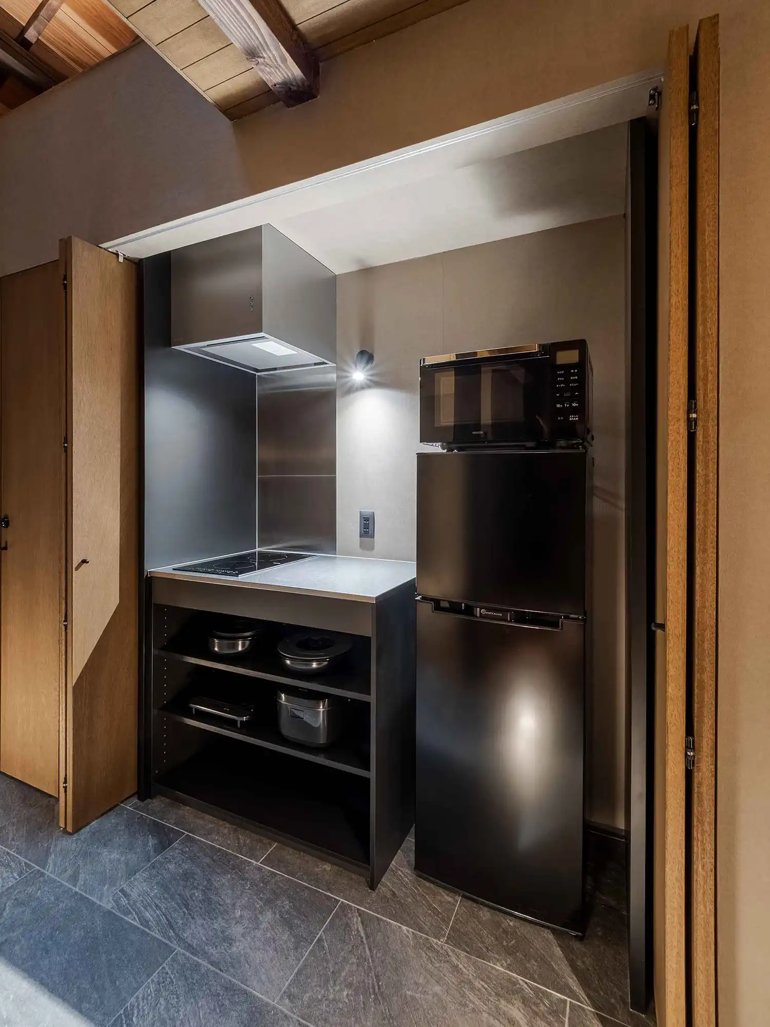 • みつな 〈一棟貸し町家〉 1F キッチン 会話を楽しみながらお料理ができるオープンキッチン。食器類、調理器具から電子レンジ、炊飯器などの家電まで充実のアイテムが揃っています。