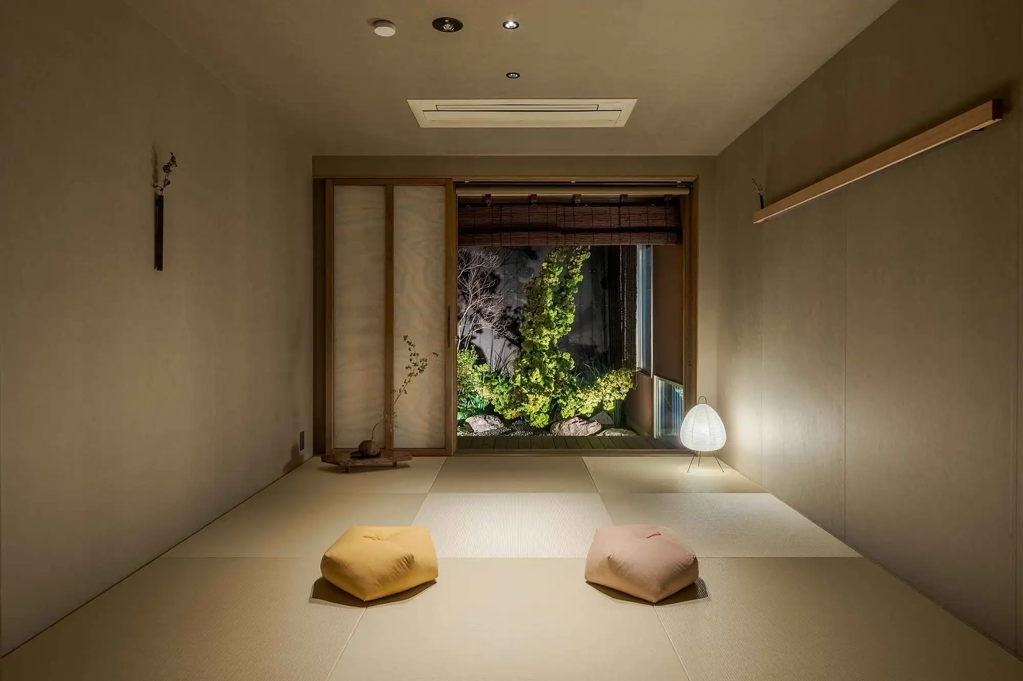 • みつな 〈一棟貸し町家〉 1F 坪庭 額縁庭園として、絵画のように四季折々の景色を楽しめる坪庭。和の趣にあふれた木々も夜はライトアップされ、より幻想的な雰囲気をお楽しみいただけます。
