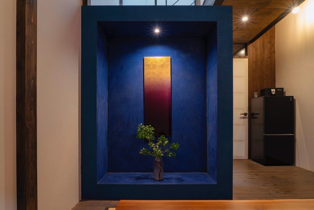 アートには金箔を使って朝日のような煌めきを表現。背後の青い壁にはすべて和紙が貼られています。金箔や和紙など和の伝統的な素材を使いながらもモダンな雰囲気が漂う「床の間」。