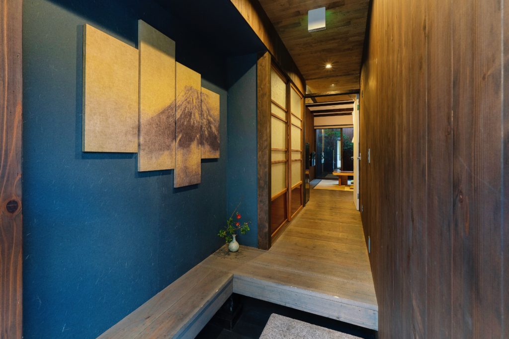 深い青の壁に映える、あけぼの(夜明け)の空のようなアートが飾る一棟貸し町家「町家レジデンスイン京都 東寺あけぼの庵」。