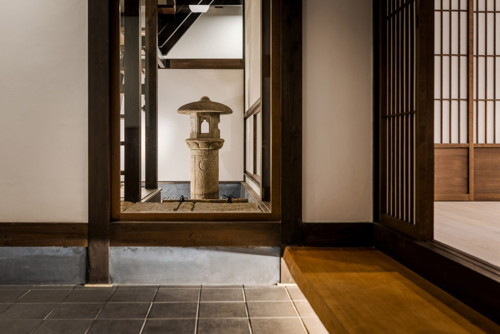 町家の中心にある印象的な「石灯籠」。石灯籠は、千利休が大成した茶道とともに独自の日本文化として茶庭にも設えられてきました。茶室までの道中に非日常へと誘い日本の侘び寂びを感じる演出と、客人をもてなす心が茶庭のひとつひとつには込められています。