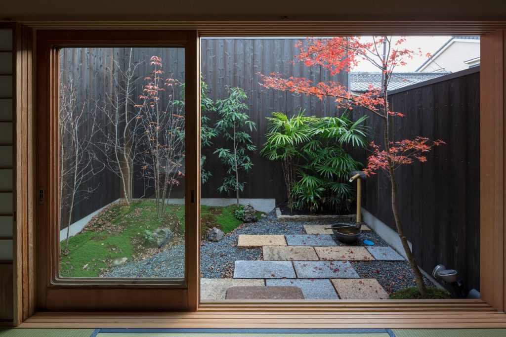 庭の景色と窓枠や鴨居がまるで切り取った絵のように見える一棟貸し京町家宿「嶋原 懐傳 – しまばら かいでん」。