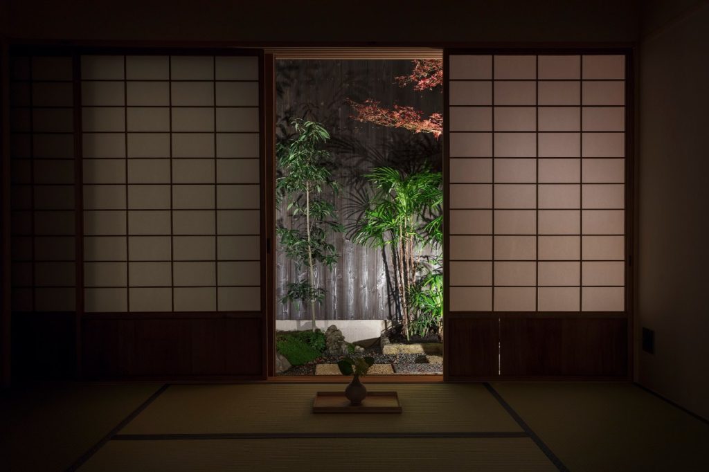 「嶋原 懐傳 – しまばら かいでん」では、この和室の障子を開けると隣にあるリビングからも坪庭が眺められます。ご宿泊の際は、畳の上に足をのばして和室から、ソファにゆったり腰を掛けてリビングから、坪庭の景色をお楽しみください。