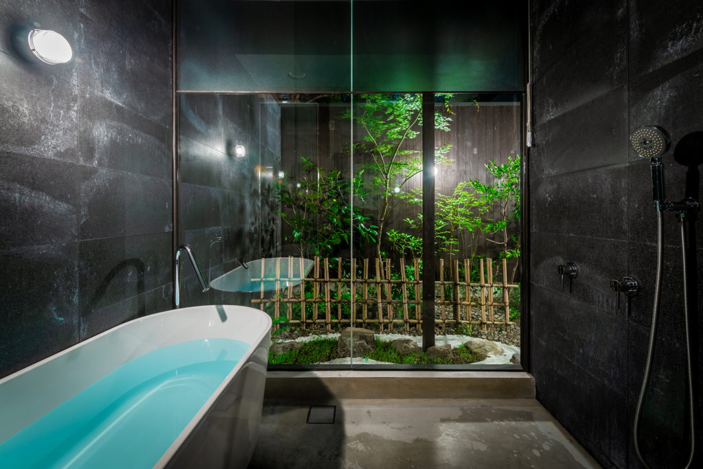 坪庭の緑を間近に、露天風呂気分でお風呂が楽しめる一棟貸し町家「町家レジデンスイン京都 壬生辻町 双宿 – そうしゅく」。