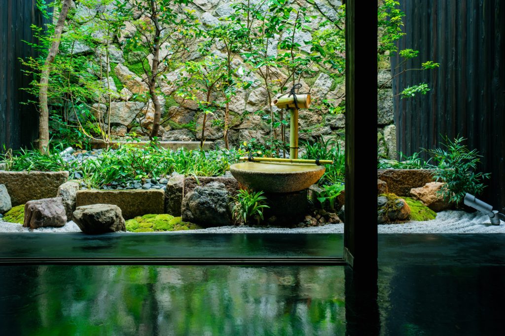坪庭が水面に浮かんでいるような幻想的な町家