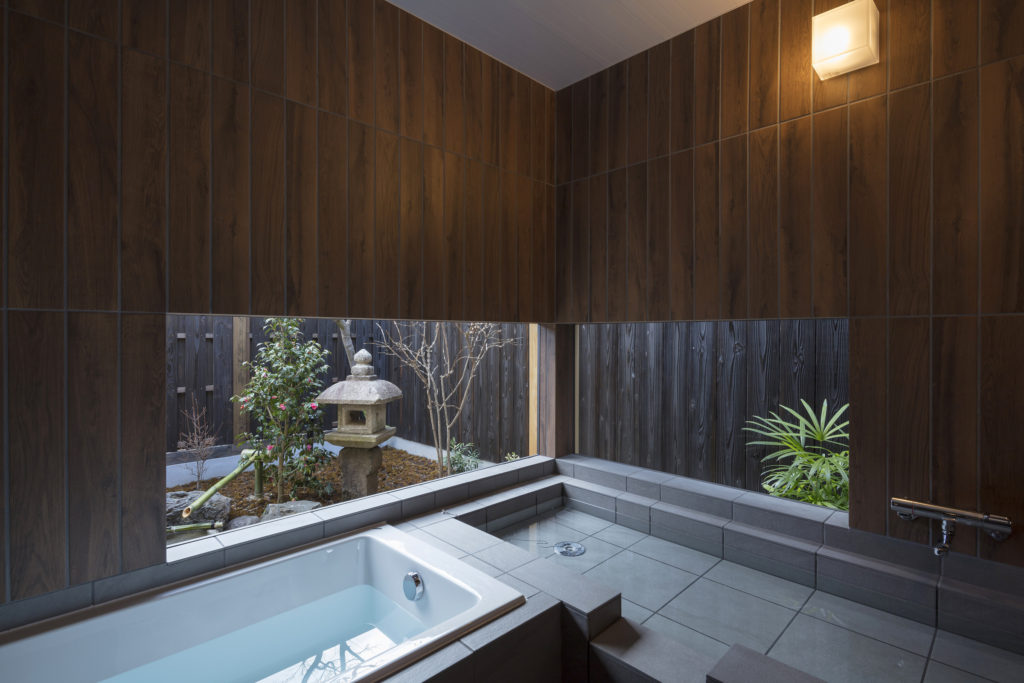 坪庭の見える浴槽で“寝湯”も楽しめる町家